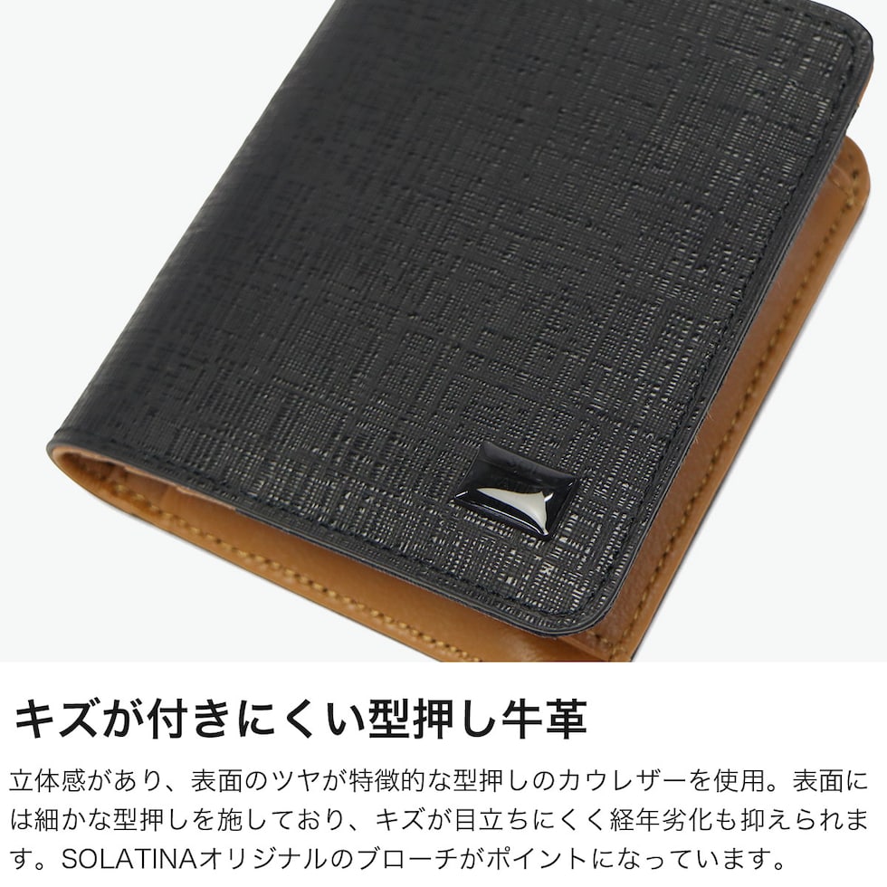 | 上品な艶と立体感で 手元に輝きをプラス 立体的な表情と上品な艶が際立つ細やかな型押しが魅力の『College series』の二つ折り財布。SOLATINAオリジナルのブローチが微細なアクセントを添え、傷が目立ちにくい仕上がりに。内装はラムレザーでしっとりとした手触りが高級感を引き立てています。通常の二つ折りよりコンパクトながら、BOX型の小銭入れやカード収納など、機能性も充実しています。 |
