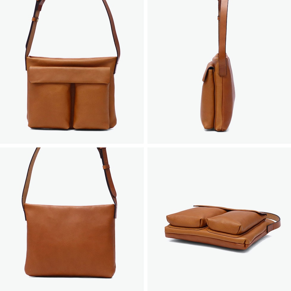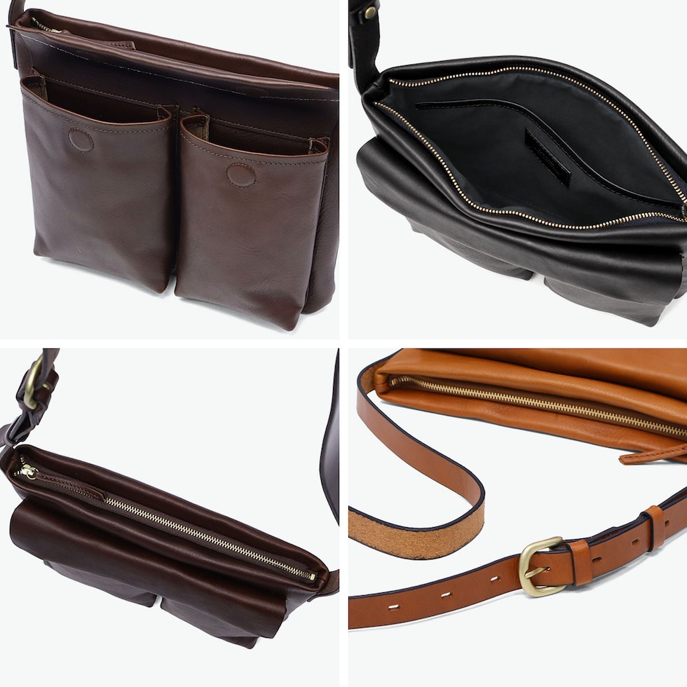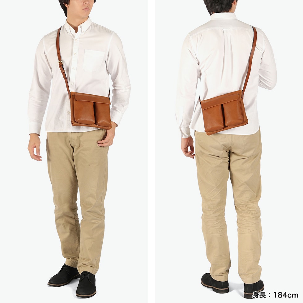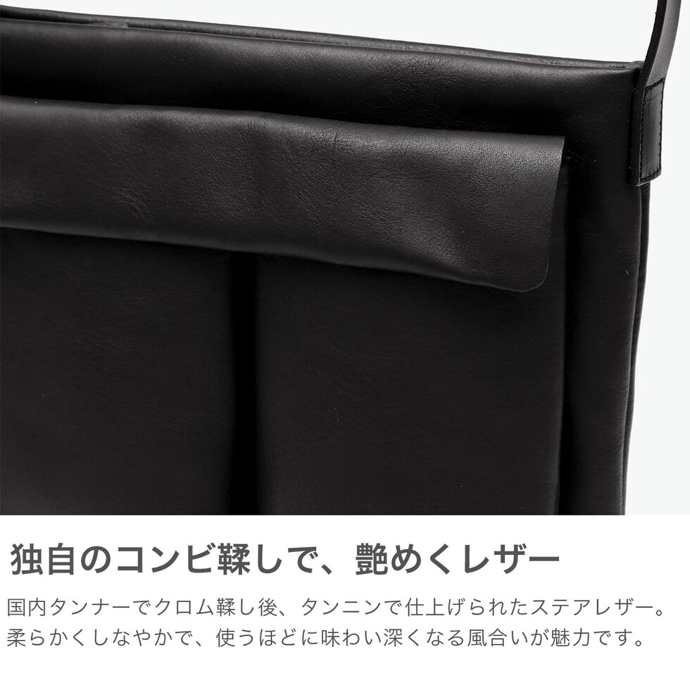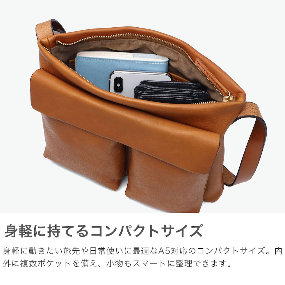 | 素材の上質さが光る シンプルで機能的なバッグ 兵庫県姫路市のタンナーが手がける、クロームとタンニンの独自のコンビ鞣しを施した『cb』のショルダーバッグ。柔らかくしなやかな風合いを持ちながらも、革に程よい締まりがあるのが特徴です。アメリカ空軍のヘルメットバッグをデザインソースに、上質レザーで洗練された佇まいに仕上げました。日常使いに最適なコンパクトサイズで、フロントと内装のポケットにより小物もすっきり収納可能。機能性と美しいデザインを両立し、カジュアルからきれいめまで幅広く活躍する大人の万能バッグです。 |