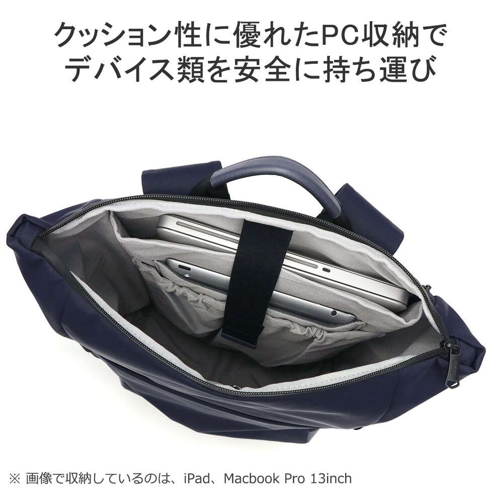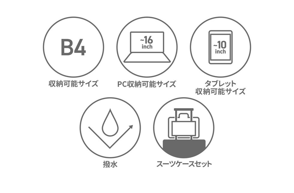 | 仕様 | <外側> ジップポケット(L)×1 └ 内蔵 ポケット(XS)×1 カードポケット×1 ジップポケット(S)×2 ポケット(S)×1 <内側> PC収納×1 タブレット収納×1 ベルクロポケット(L)×1 ジップポケット(M)×1 メッシュジップポケット(XS)×1 ポケット(XS)×1 |