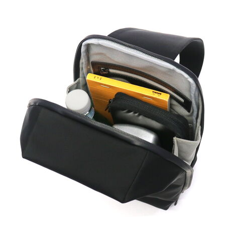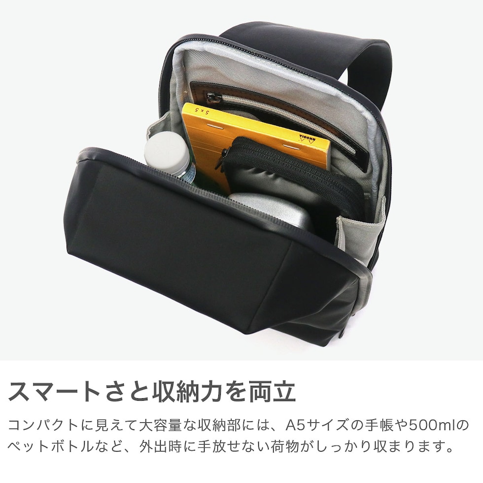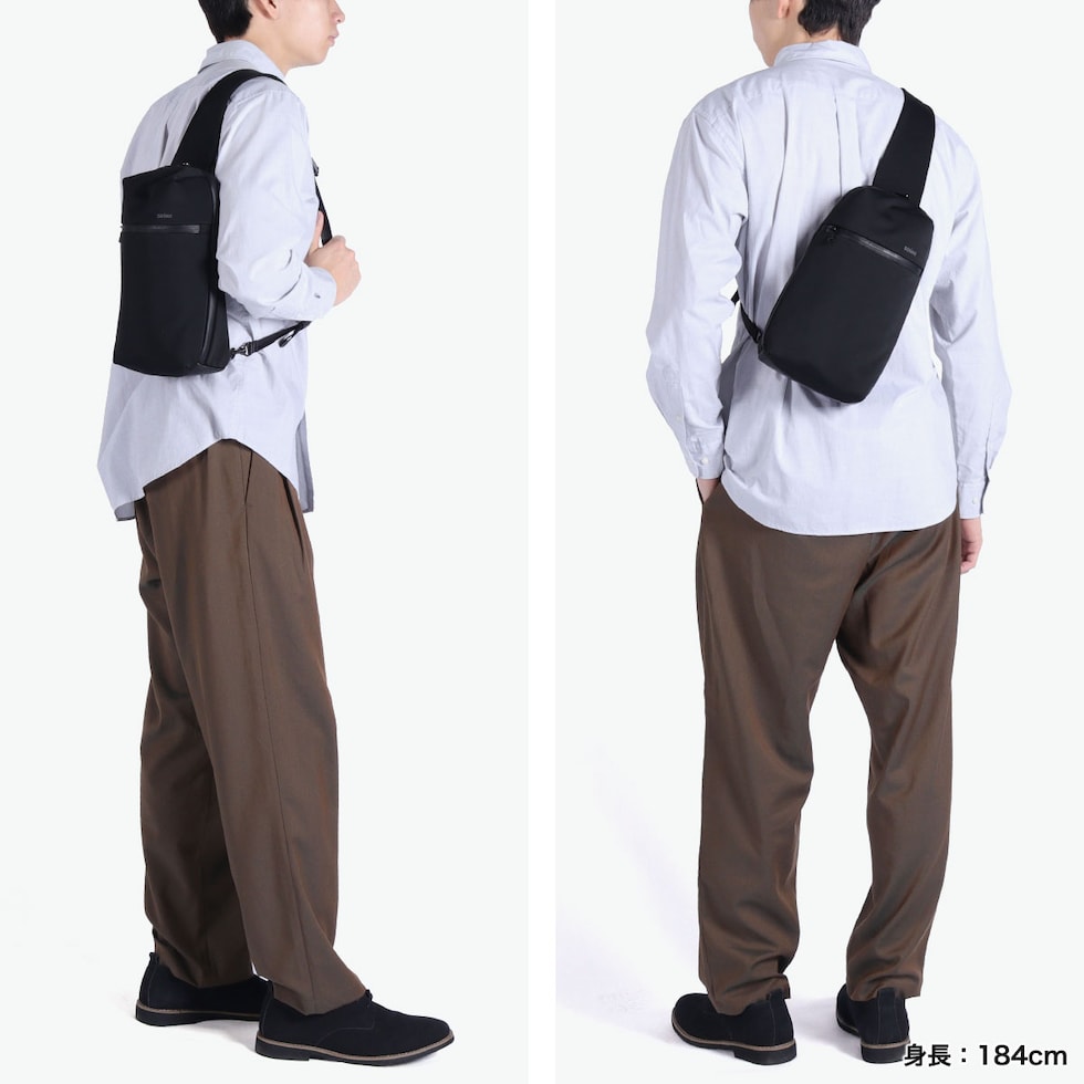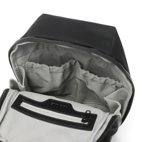 整理のしやすさをこだわり抜いた機能的なシリーズ『TRIM/トリム』のボディバッグ。コンパクトな見た目以上の収納力で実用性の高い仕上がりです。メイン素材は、上品で適度に光沢のある撥水ナイロンを使用。底面部分には、マイクロファイバーをベースにした素材を採用しており、革のような高級感がありながらも軽量かつ耐久性に優れた機能がポイントです。