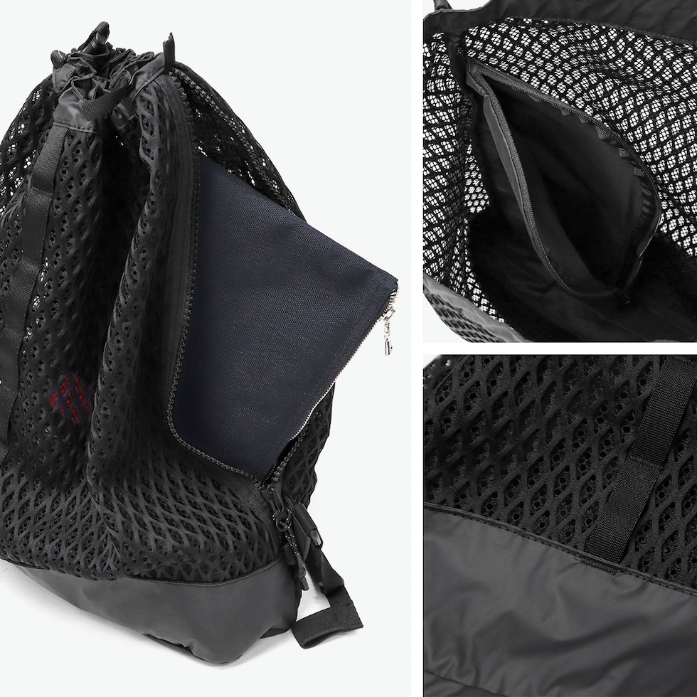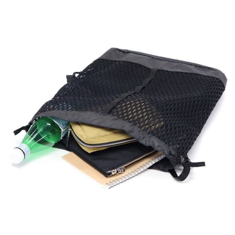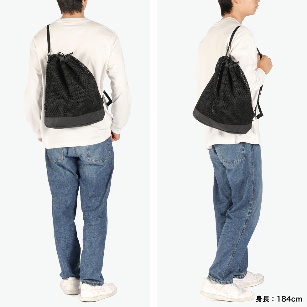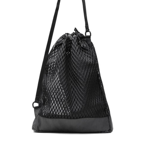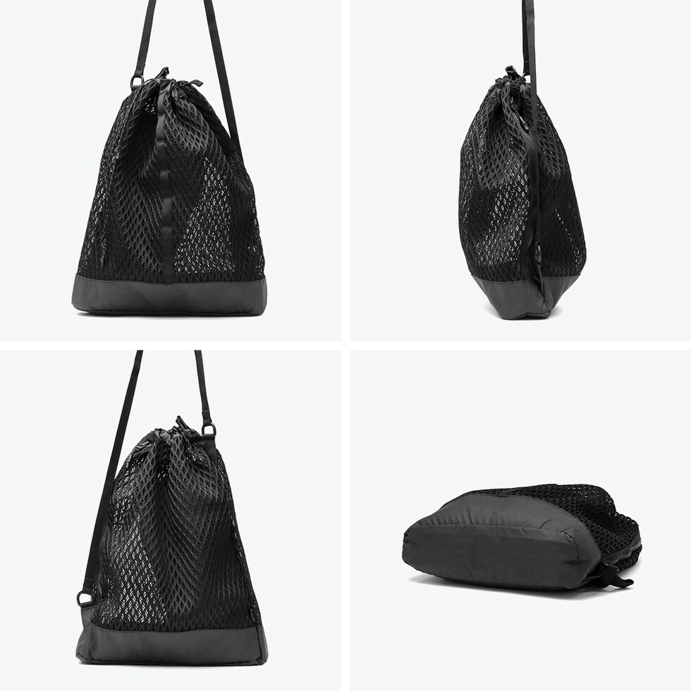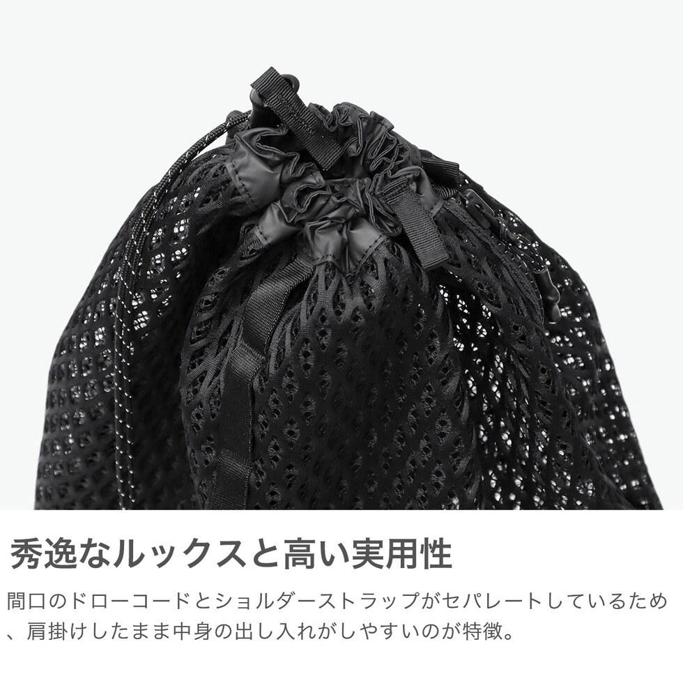 涼しげなメッシュバッグ メイン素材に表の太いラッセルと裏のラッセルメッシュが一体となった、ダブルメッシュを採用した巾着タイプのショルダーバッグ。中身が見やすく出し入れもスムーズに行えるデザインです。従来のナップサックとは異なり、間口のドローコードとショルダーストラップがセパレートしているため、肩掛けしたままでも間口の開閉や中身の出し入れがしやすいのが特徴。デイリー使いに加え、夏はビーチアクティブなどでも重宝するアイテムです。 |