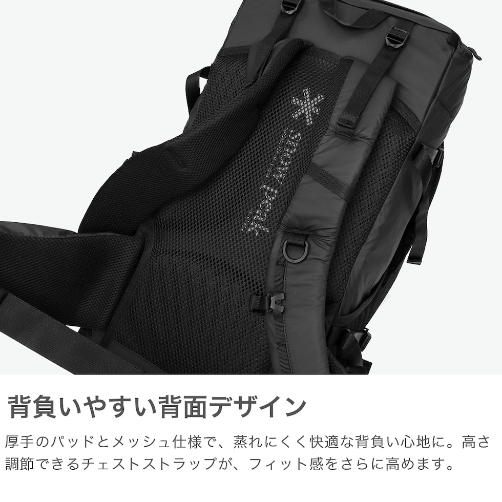 | 幅広いシーンを想定した 多機能バックパック アウトドアにピッタリな27L容量のバックパック。大きめサイズで必要な荷物がしっかり収納でき、優れた機能性でアクティブな旅のサポートをしてくれます。シンプルなデザインでユニセックスにお使いいただけます。 |