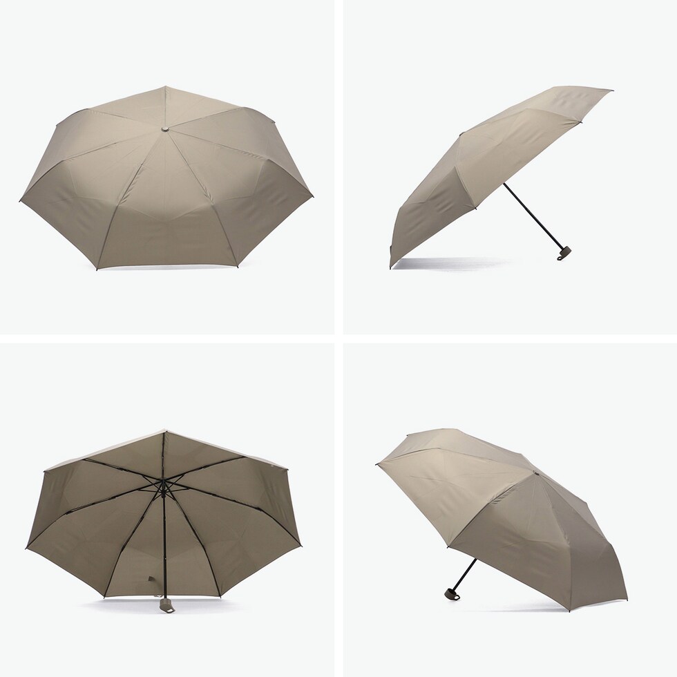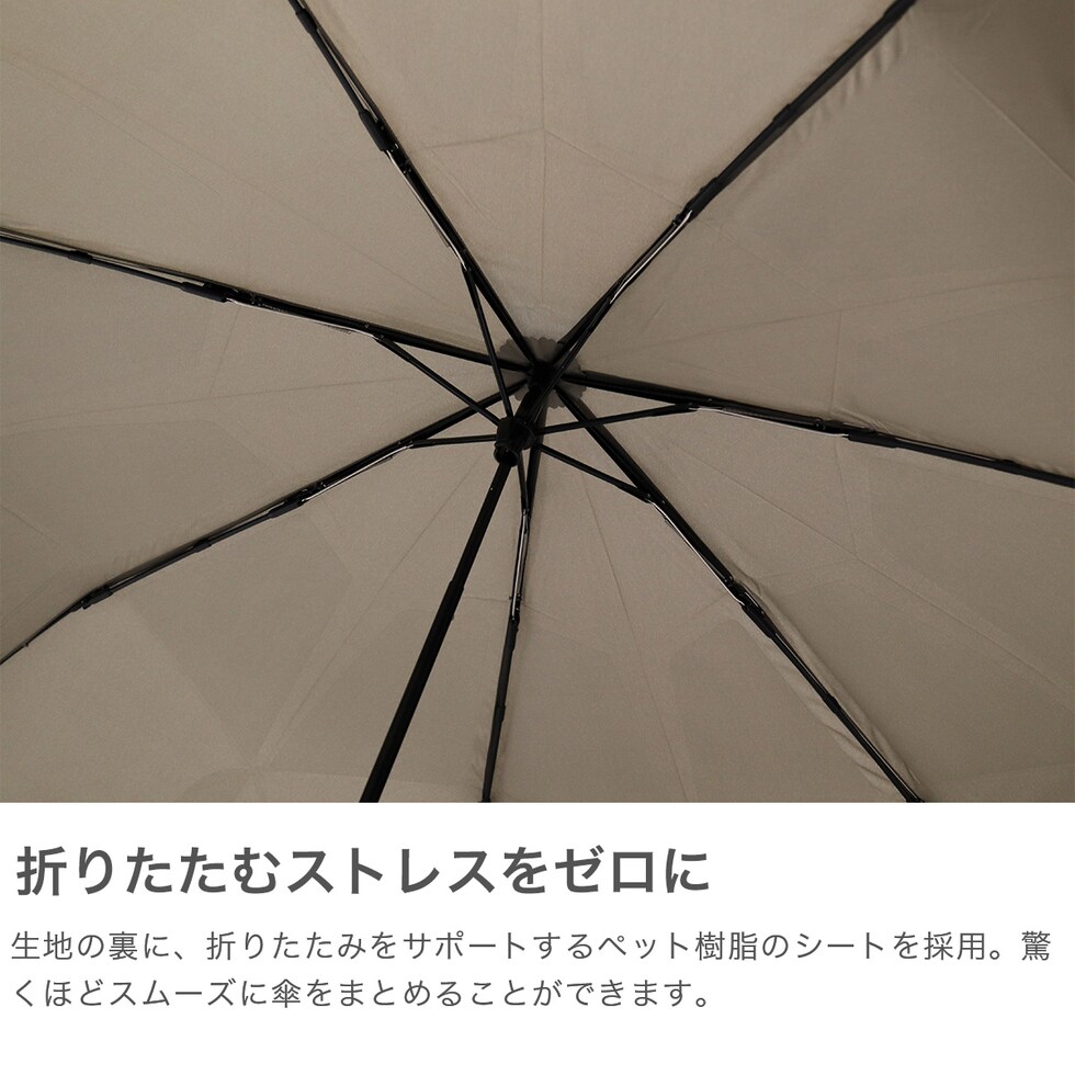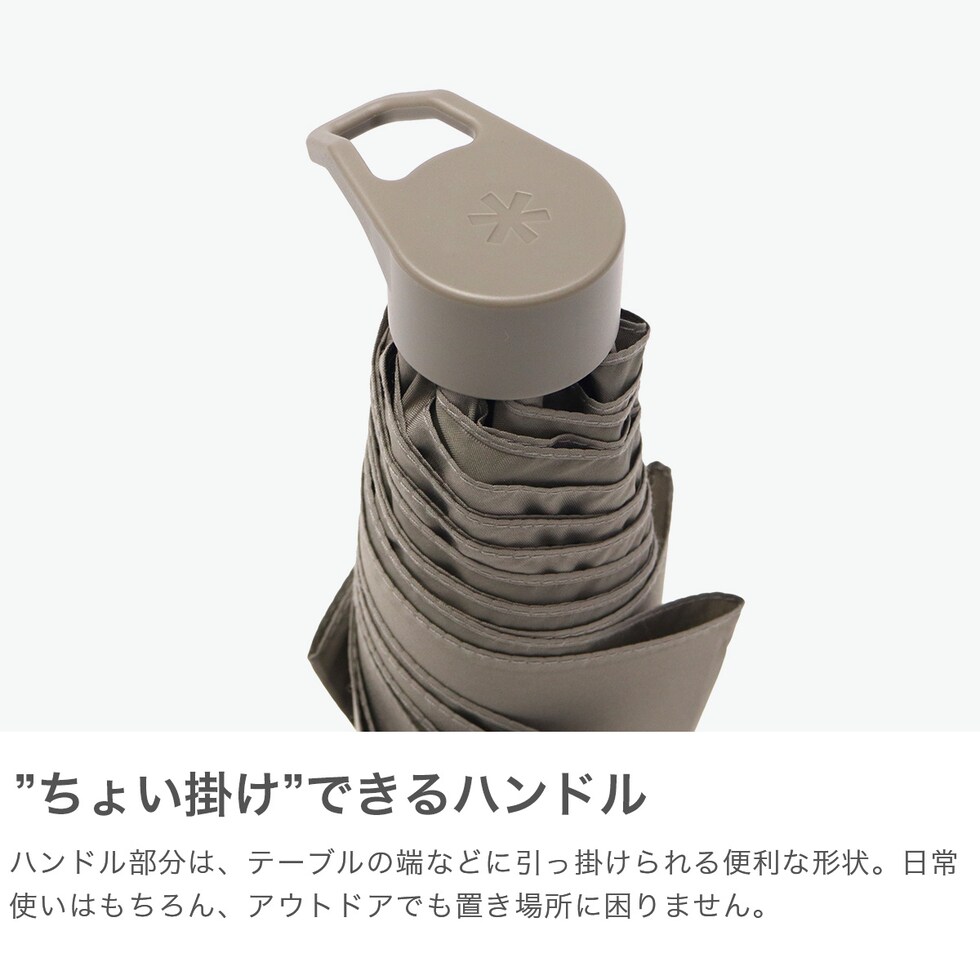 使い勝手の良い折り傘 折り畳む手間や置き場所の問題を解決するために開発した、スマートで新しい折りたたみ傘。生地の裏に畳むのをサポートするペット樹脂のシートが貼り付けられており、一瞬でスムーズに折り畳むことが可能です。持ち手部分はテーブルの端などにフックのように掛けられる形状で、置き場所に困りません。普段使いはもちろん、アウトドアシーンにもぴったりな1本となっています。 |