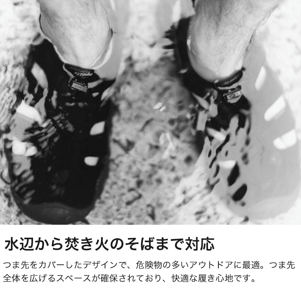 快適な万能サンダル 持続可能なモノづくりをする姿勢や、製品を通じて自然を楽しむという想いが共通するスノーピークとKEENが初のコラボレーション!コラボアイテム「HYPERPORT H2」は、マキシマルなミッドソールと高グリップのアウトソールがポイント。トレイルから街中、さらには水辺から焚き火のそばまで幅広いシーンに対応する汎用性を備え、終日快適な履き心地と高いパフォーマンスを提供する多用途サンダルです。 |