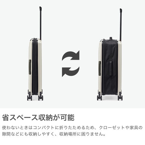 折りたたみ式キャリー 旅行時には大きく使え、保管時にはコンパクトにまとまる、60L容量のスーツケース。折りたたむと幅がわずか12.5cmとなり、収納スペースを取りません。スタイリッシュなデザイン性に加え、軽量ながら耐久性が高く収納力にも優れた高機能なアイテムです。 |