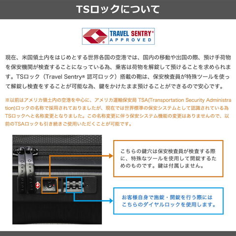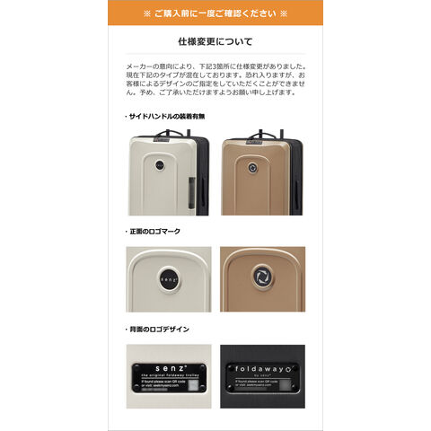 | <購入前にご確認ください> ・メーカーの意向により、付属品の収納袋や箱、製品の仕様やデザインは予告なく変更となる場合がございます。 ・下記による返品・交換はお受けすることができませんので、予めご了承ください。 └ 製品の性質上による細かいキズや塗装ムラ、気泡などがある場合。 └ 配送用の段ボールにキズ、汚れ、破損がある場合。 ・エキスパンダブル機能付きの製品は、マチ拡張時の3辺の和が機内持ち込みサイズ、預け入れ無料サイズを超える場合がございます。また、航空会社や飛行機の機種などによって規定が異なりますので、予めご確認の上お求めください。 ※機内持ち込みサイズ目安表はこちら ・荷物をお預けの際は、キャスターストッパーをOFFにしてください。 ・水濡れ(雨・汗など)や日焼けにより、色落ち、退色する恐れがございます。商品のお取り扱いには十分にご注意ください。 ・柄の位置やカラーバランスなどは、生地の裁断や製造過程、素材の特性により画像とは異なる場合がございます。商品をお選びすることはできませんので、予めご了承ください。 ・極力実物に近い色味を再現しておりますが、モニター等の条件により画面上と実物では色味が異なって見える場合がございます。 |