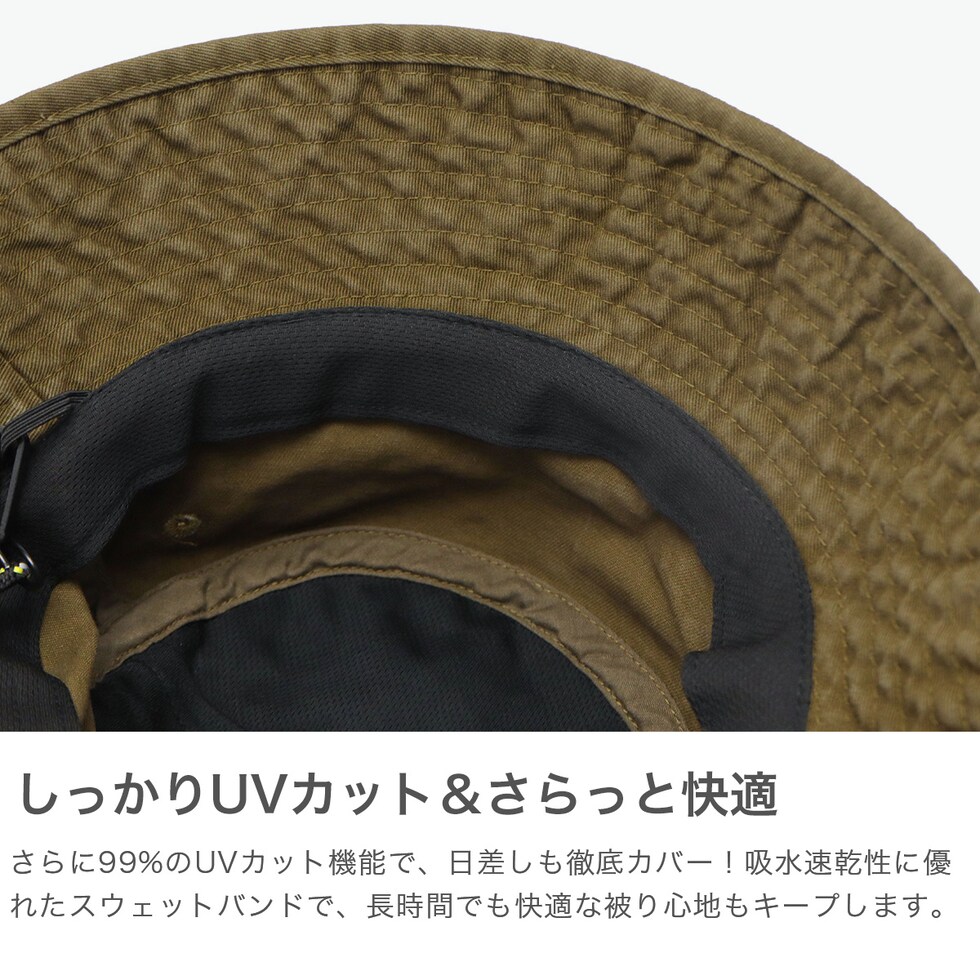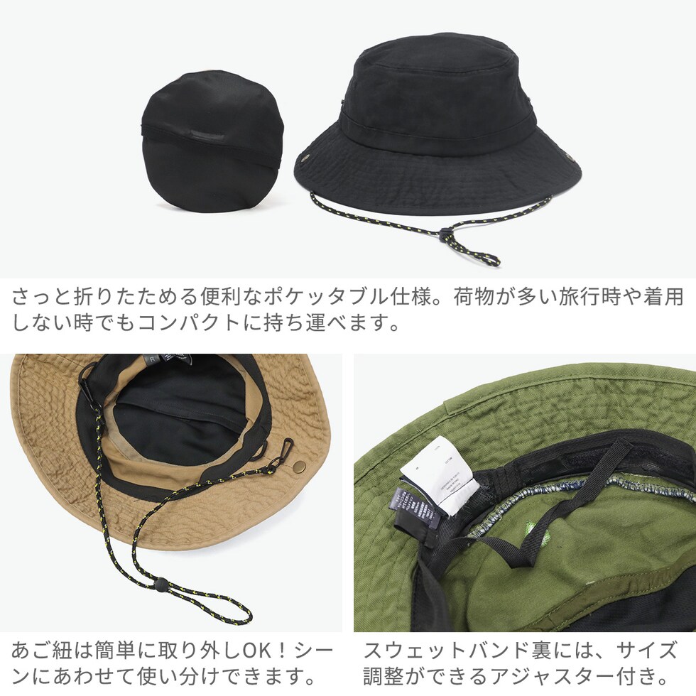 野外での活動を快適に インセクトシールド加工で虫の接触をしっかりブロック。また、汗を素早く吸収する吸水速乾スウェットバンドやあご紐付きで、キャンプやフェスなどのアウトドアシーンでも快適な装着感を長時間キープ。折りたたんでバッグに収納できるポケッタブル仕様で、旅行や外出にも最適です。 |