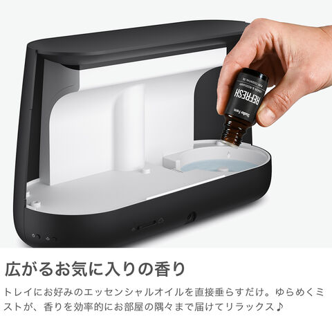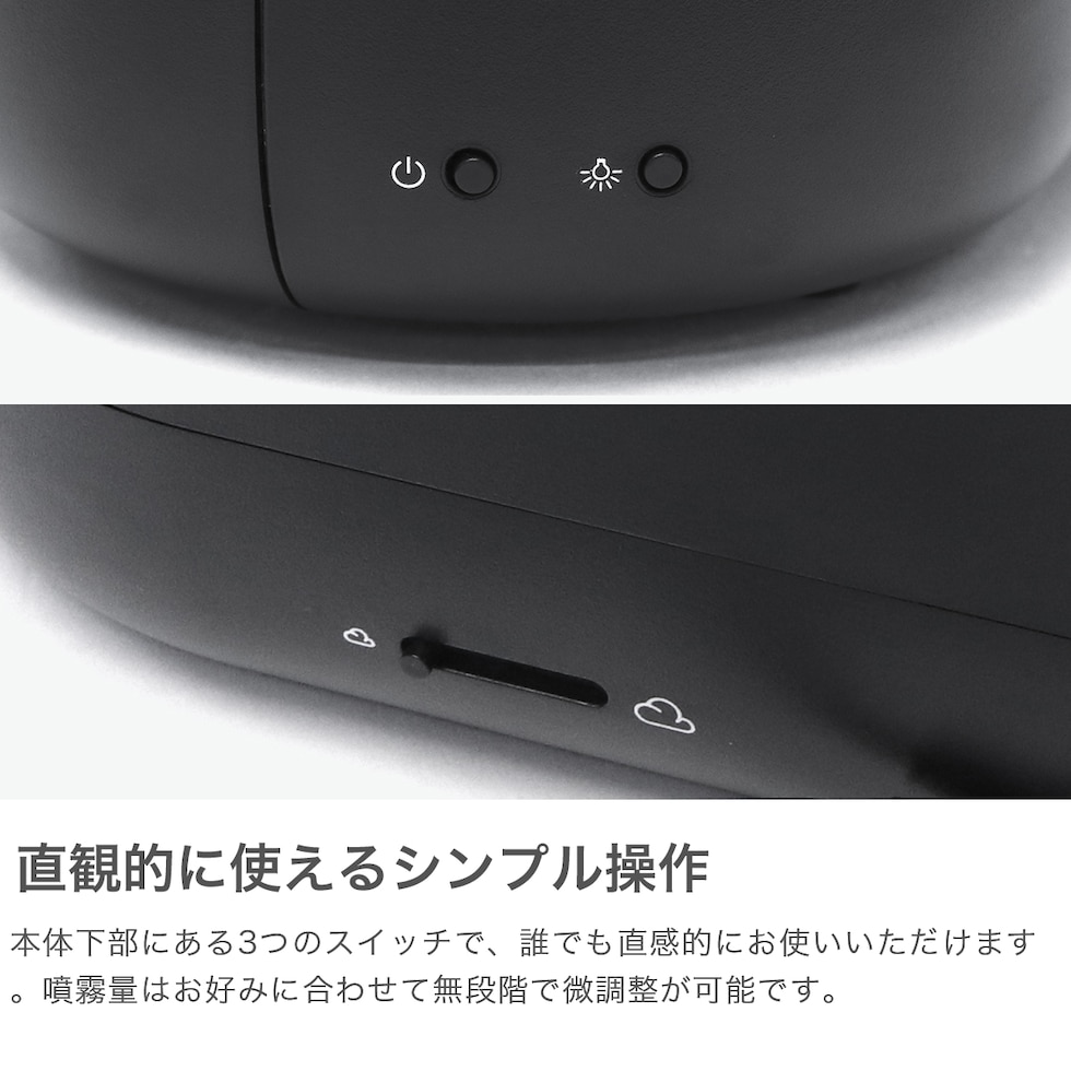 | 仕様 | <電源> 定格電圧:100V 消費電力:24W(MAX運転時) <タンク容量> 2.5L <加湿方法> 超音波式 <加湿能力> 約 200ml/h <運転音> 27-30db(A) <電源コード> 約 1.5m <推奨面積> 約10平方メートル(約6畳) <機能> 加湿量無段階調整(スライド式)、LEDライト調光機能、アロマ機能、自動OFF機能 <付属品> ハイジーンタブ、クリーニングブラシ、ACアダプター、取扱説明書(保証書含む) |