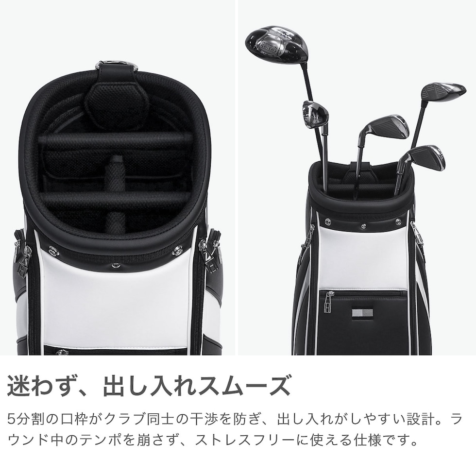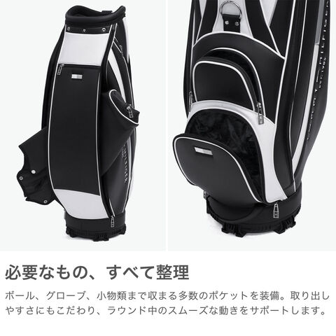 | 軽快なプレーに寄り添う 機能美と品格 『TOMMY HILFIGER GOLF』のブランドイメージを落とし込んだカートタイプのキャディバッグ。軽量シボ合皮を採用することで、持ち運びの時の負担が軽減され快適な使用が可能です。ユニセックスでお使いいただけるシンプルな高級感漂うデザインとなっています。 |