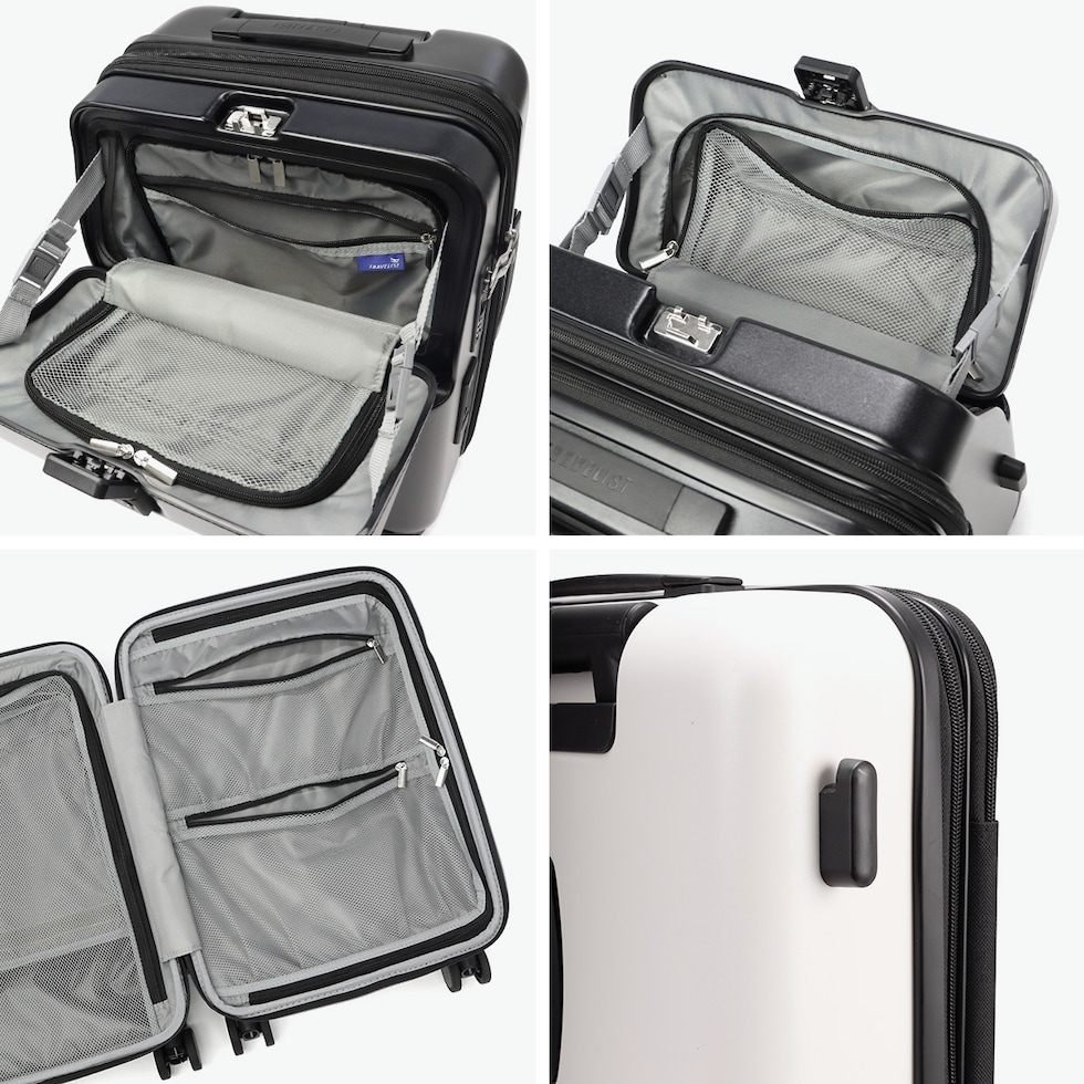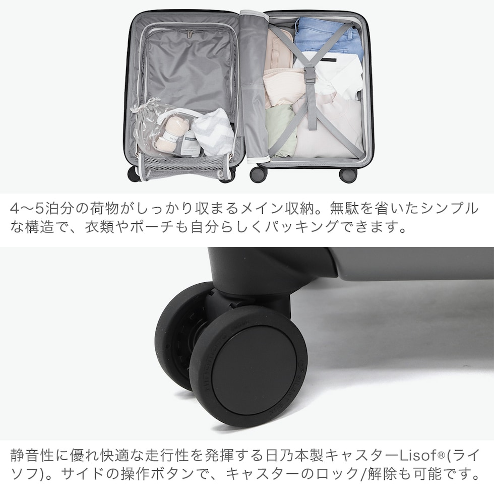 ワンタッチで荷物の出し入れが驚くほどにスムーズに行える、「世界最速1秒アクセス」を実現した『TRAVELIST』のスーツケース。移動中に便利な折り畳み式ドリンクホルダーやスマホスタンド、ちょっとした荷物を掛けられるフックを搭載。車輪はストッパー付きの日乃本社製LisofLisof(ライソフ)SIRENT RUNを使用。三菱ケミカルと共同開発したオリジナルの素材で、静音性に優れています。