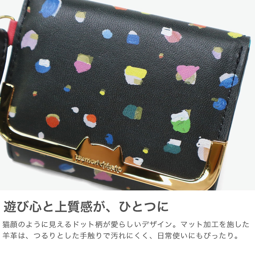 絵筆で“てんてん”と描いたようなドット柄が印象的なシリーズ。よく見ると猫顔に見えてくるシルエットと、愛らしい金具がポイントです。こちらは、コンパクトながらも使いやすいBOX型小銭入れを備えた三つ折り財布。さっとお出かけできる便利なストラップ付きです。