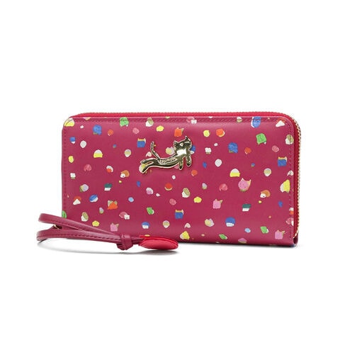 絵筆で"てんてん”と描いたようなドット柄が印象的なシリーズ。よく見ると猫顔に見えてくるシルエットと、愛らしい金具がポイントです。こちらは、充実した収納力を備えたラウンドファスナー長財布。さっとお出かけできる便利なストラップ付きです。