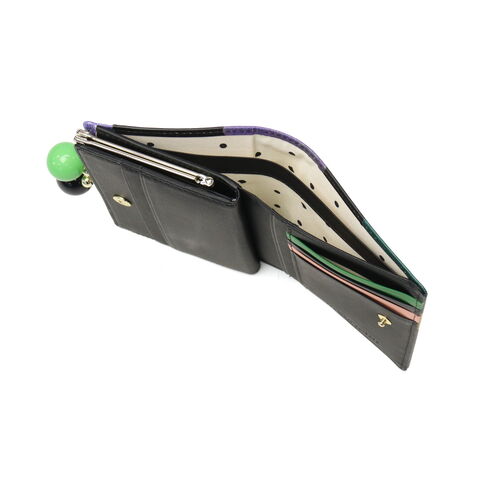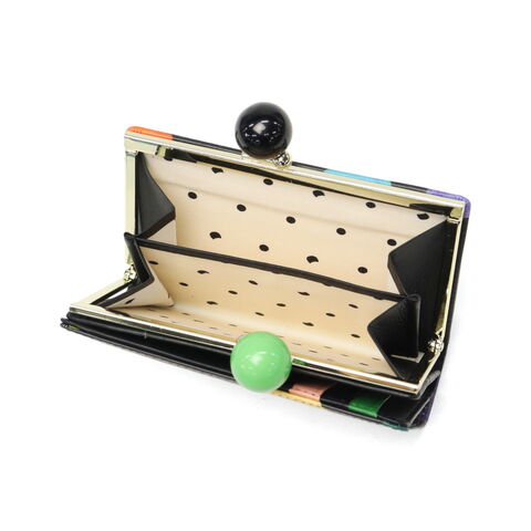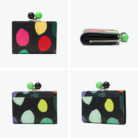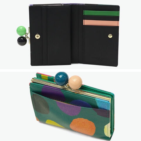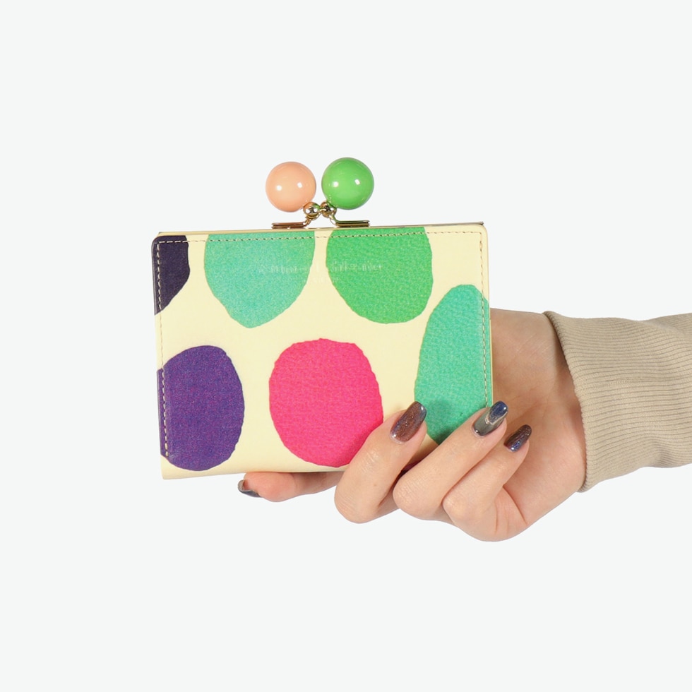 気分も明るくなる財布 大きくカラフルな水玉模様が目を引く、ポップで可愛らしいがま口付きの二つ折り財布。丸い口金がアクセントの、鮮やかな色使いと遊び心あふれるデザインが魅力です。手に取るたび気持ちも明るくなるような仕上がりで、自分用にはもちろん、ギフトにもぴったりのアイテムです。 |