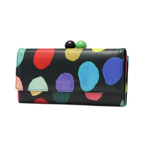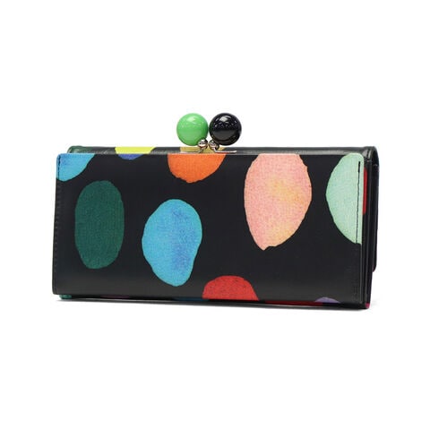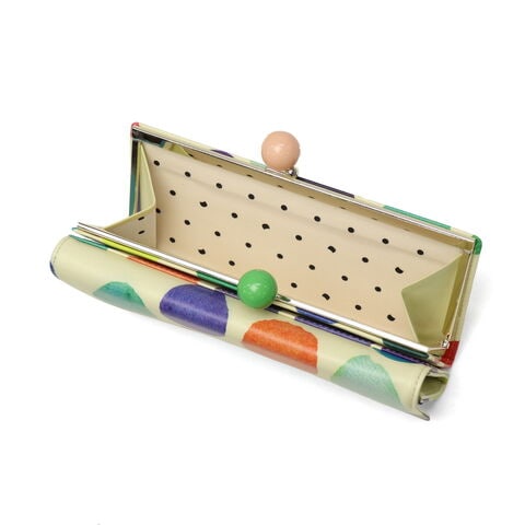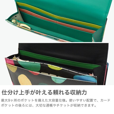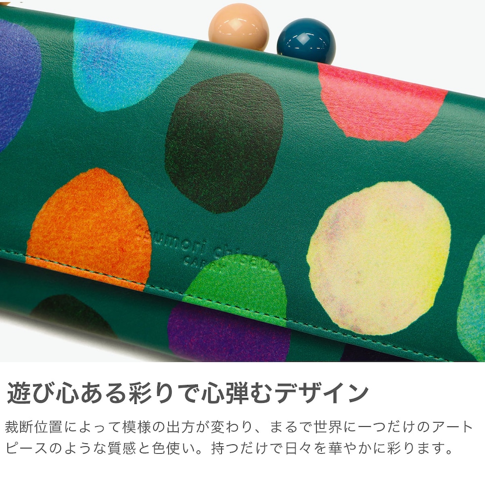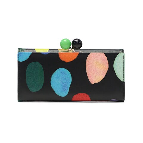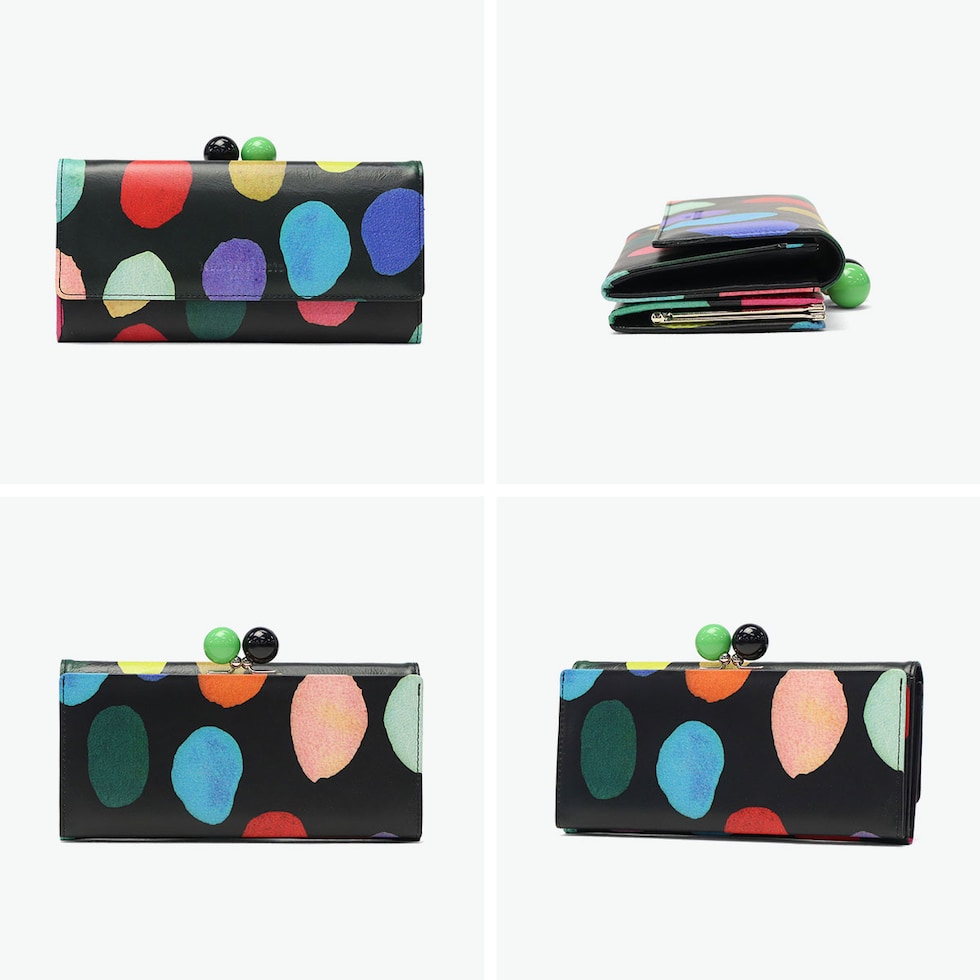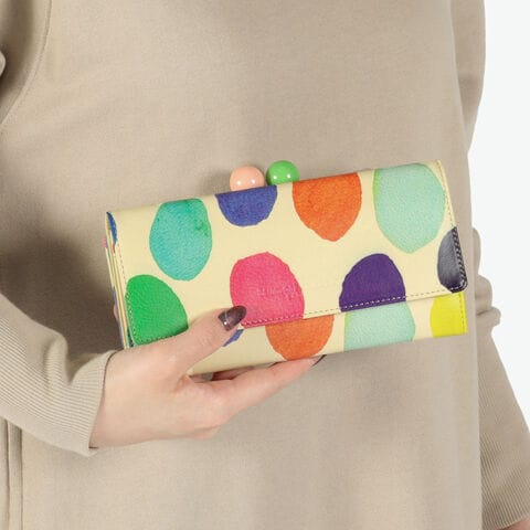 目を引くがま口長財布 大きくカラフルな水玉模様が目を引く、ポップで可愛らしいがま口付きの長財布。丸い口金がアクセントの、鮮やかな色使いと遊び心あふれるデザインが魅力です。手に取るたび気持ちも明るくなるアイテムで、自分用にはもちろん、ギフトにもぴったりです。 |