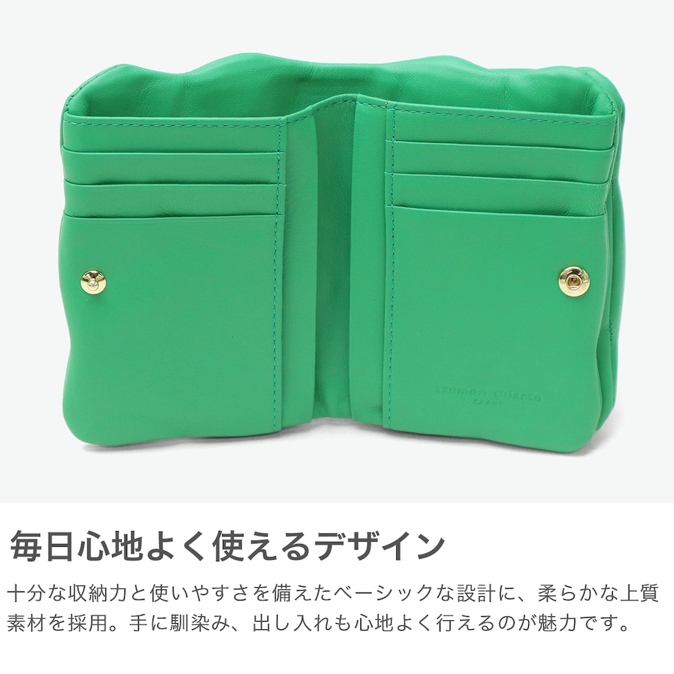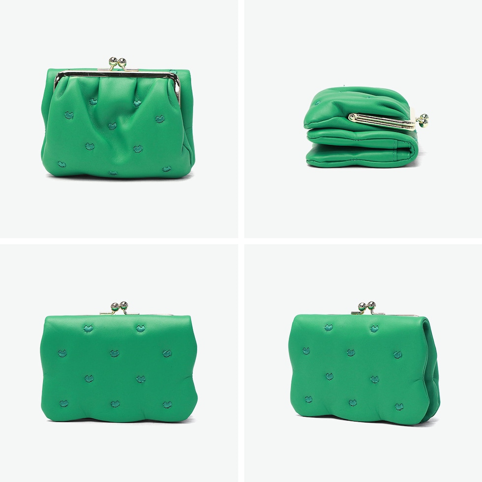 | 個性的なデザインで おしゃれに差をつける 柔らかな羊革を使用し、ふっくらとした可愛らしいフォルムが魅力のがま口二つ折り財布です。本体に施された刺繍は、ハート形のドットに見えますが、実は愛らしいネコのシルエットという遊び心あふれるデザインになっています。小ぶりな見た目に反して、使いやすさと収納力を兼ね備えた機能的な設計です。確かな日本製クオリティで、贈り物にもふさわしいアイテムです。 |
