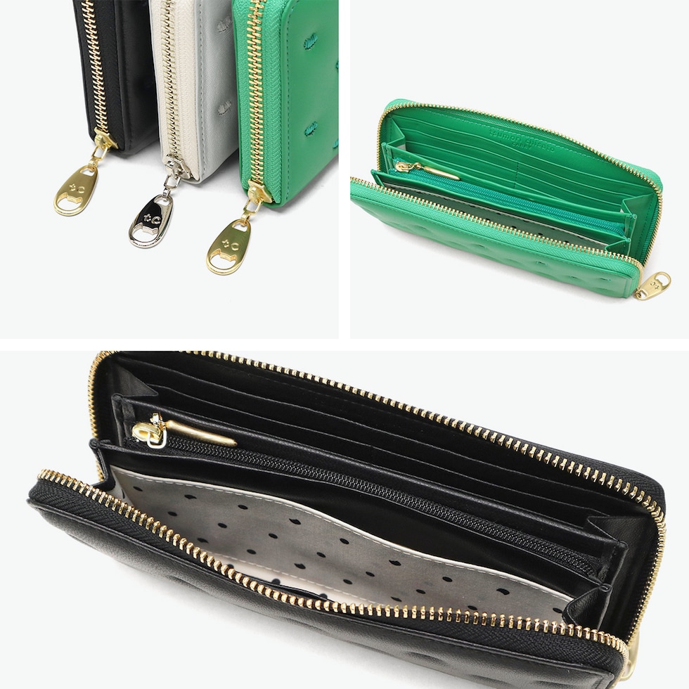 | 持つだけで気分が上がる 遊び心あふれる長財布 柔らかな羊革を使用し、ふっくらとした可愛らしいフォルムが魅力のラウンドファスナー長財布です。本体に施された刺繍は、ハート形のドットに見えますが、実は愛らしいネコのシルエットという遊び心あふれるデザインになっています。スリムな見た目ながら、カードや小銭、お札などをしっかり収納できる大容量設計です。確かな日本製クオリティで、贈り物にもふさわしいアイテムです。 |
