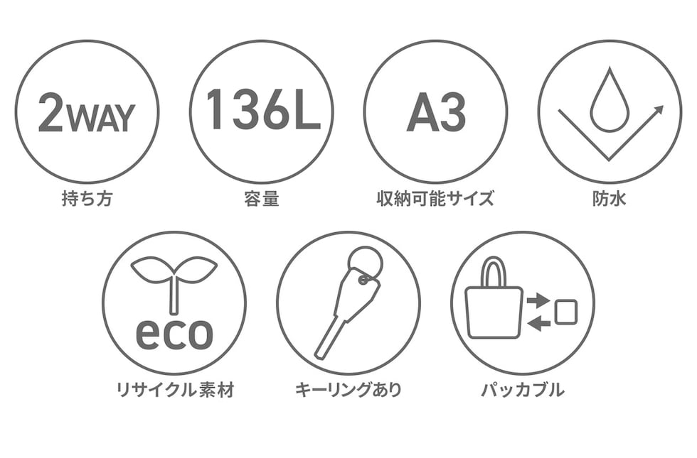 | 素材 | <表地> 1000DTPEファブリックラミネート(リサイクルポリエステル100%)、840Dリサイクルナイロン |