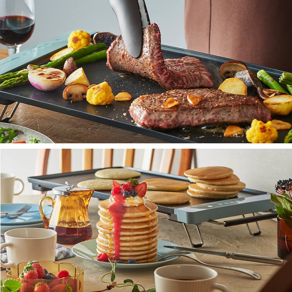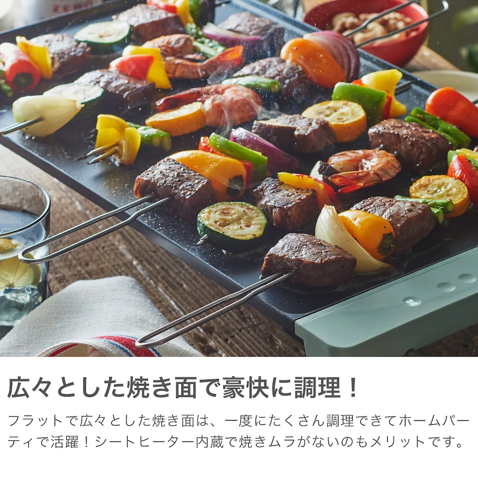 | おしゃれに調理♪ パーティーで大活躍 スタイリッシュなフォルムでホームパーティーにも映える、スリムでワイドなグリルプレート。フラットで広々とした焼き面だから、串焼きのBBQやお好み焼きにもピッタリ!シート型ヒーターでムラなく加熱、火力調節も簡単です。スタンドをたためば厚さ3cmで収納性もよく、丸洗いできる優れものです。 |