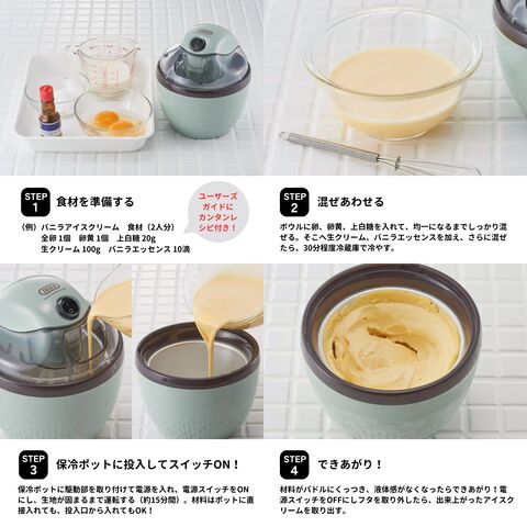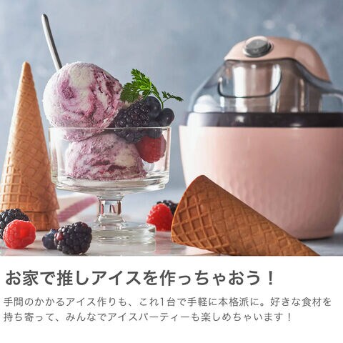 自家製アイスが楽しめる♪ かわいいフォルムでパーティでも映えることまちがいなしのアイスクリームメーカー♪保冷ポットを冷凍庫で冷やした後は、材料を入れてスイッチを入れるだけで約15分で自家製アイスクリームのできあがり!ふたの食材投入口から食材を追加できるからアレンジもできちゃう優れモノ♪付属のユーザーズガイドにはカンタンレシピが付き、食材が触れる部分は丸洗いできるので衛生的なのもポイントです! |