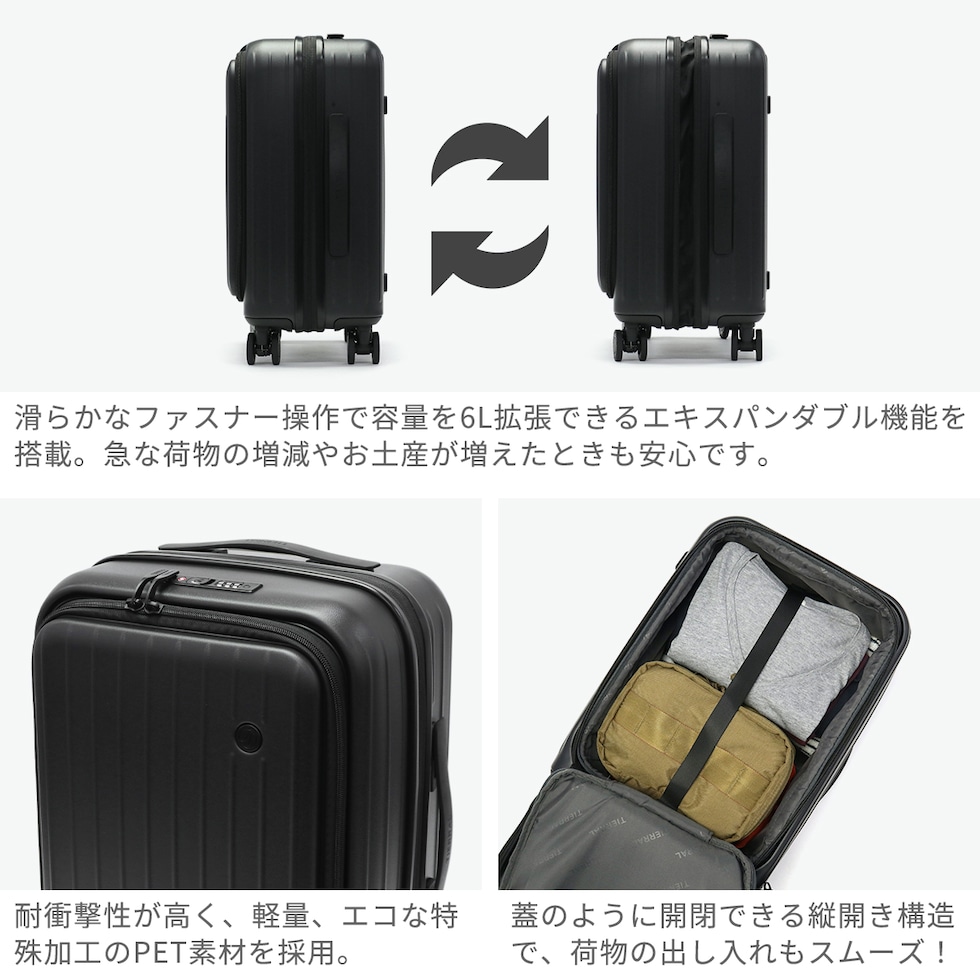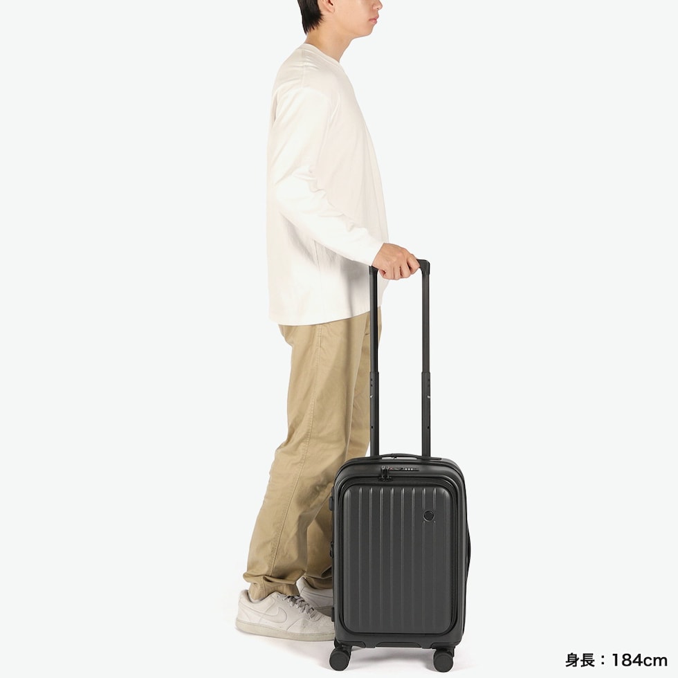 | 備考欄 | ・本体内側にあるファスナーを無理に開けないでください。本ファスナーは製造上のものであり、ポケットではありません。 ・内側のベルクロテープ部分はホットメルトで接着されておりますが、メンテナンス時に使用する箇所となります。不良品ではございませんので、予めご了承ください。 <商品のモデルチェンジについて> 【2025年5月~】 ・本体素材の変更 ・外側ロゴ、キャスターのデザイン変更 ・内装ポケット、PC収納の仕様変更 ・ブレーキの仕様変更 ・ハンドルとファスナー引手の仕様変更 ・外側フックの搭載 ・重量、容量、高さの変更 |