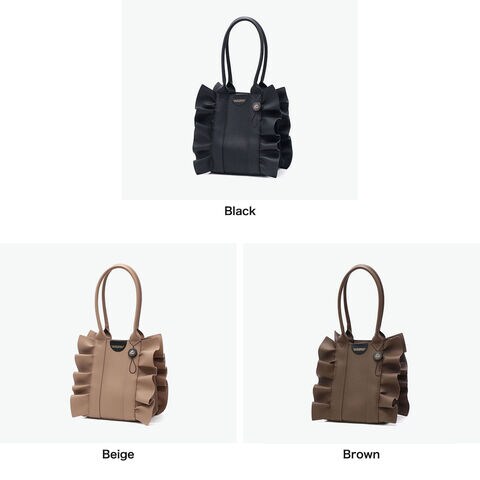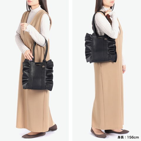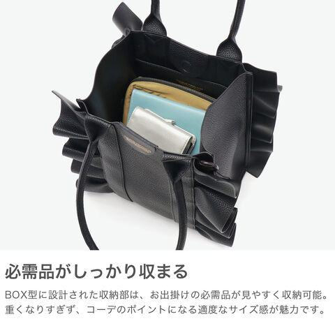 トレンドのフリルをあしらったフェイクレザーバッグ。しっかりとマチを確保し、見た目以上の収納力を実現しました。長財布やペットボトルも収まり、お出かけに必要なアイテムをスマートに整理。上品な印象ながらも、カジュアルスタイルにも馴染むデザインで、幅広いシーンに活躍します。