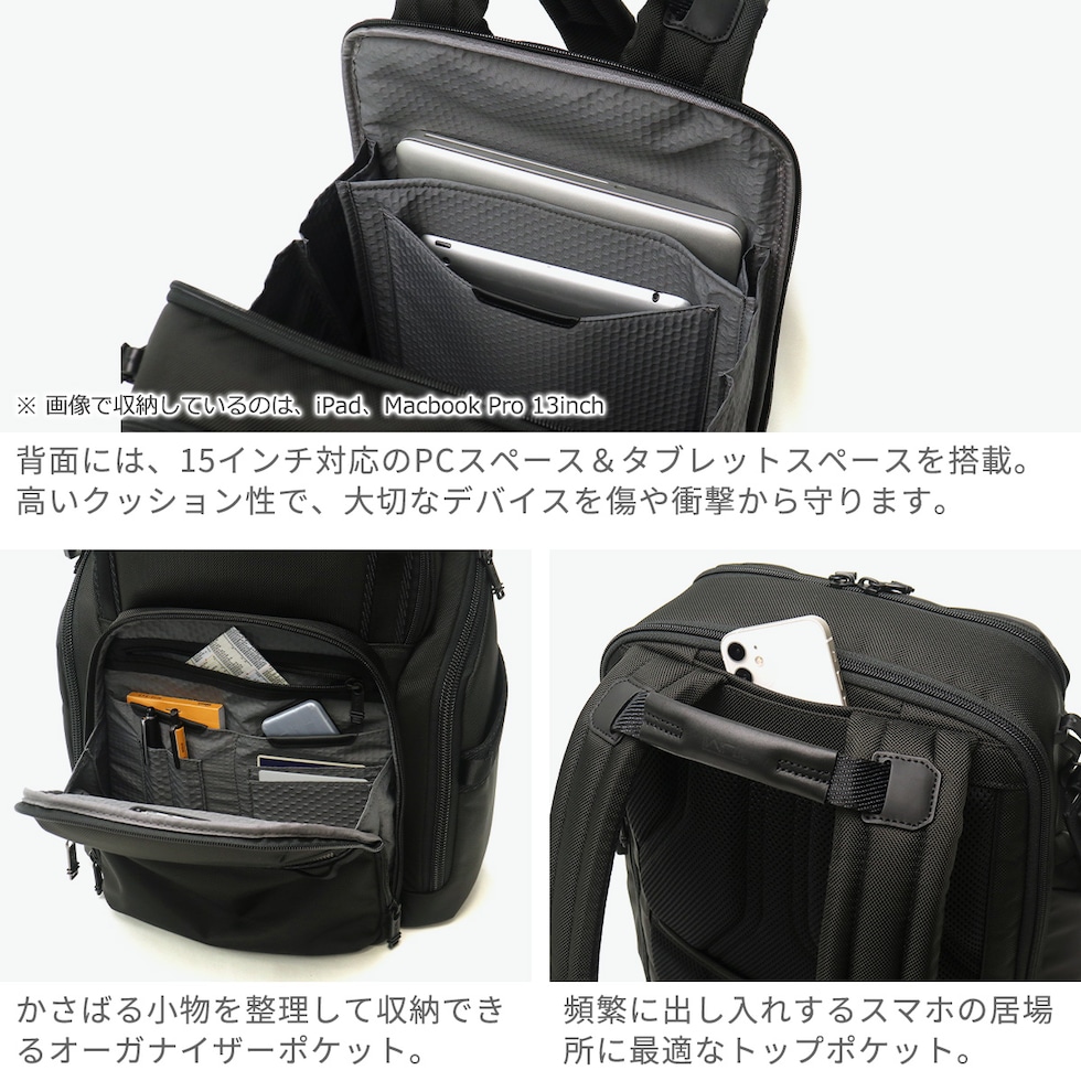 | 仕様 | <外側> ポケット×6 <内側> ポケット×7 カードポケット×2 PC収納×1 タブレット収納×1 ペンホルダー×2 キーフック×1 <付属品> ネームタグ×1 |