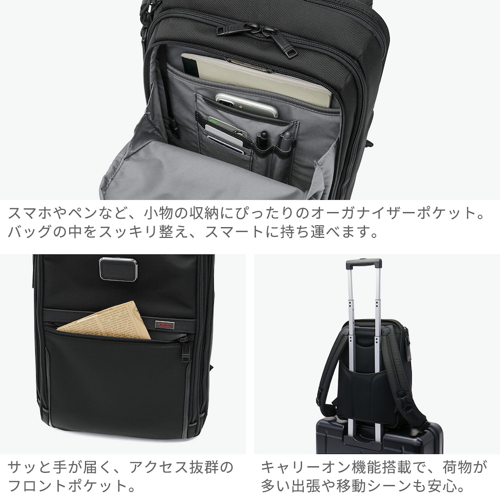 | 進化した機能美 ビジネスをスマートに TUMIならではの機能性とデザイン性がさらに進化した「Alpha 3/アルファ 3」のバックパック。通勤時の慌ただしい移動時もハンズフリーで快適に使うことができ、ビジネスシーンに馴染む上品なルックスを兼ね備えています。アイテムを効率よく整理できる豊富な収納スペースも完備。実用性とデザイン性を高次元で両立した逸品です。 |