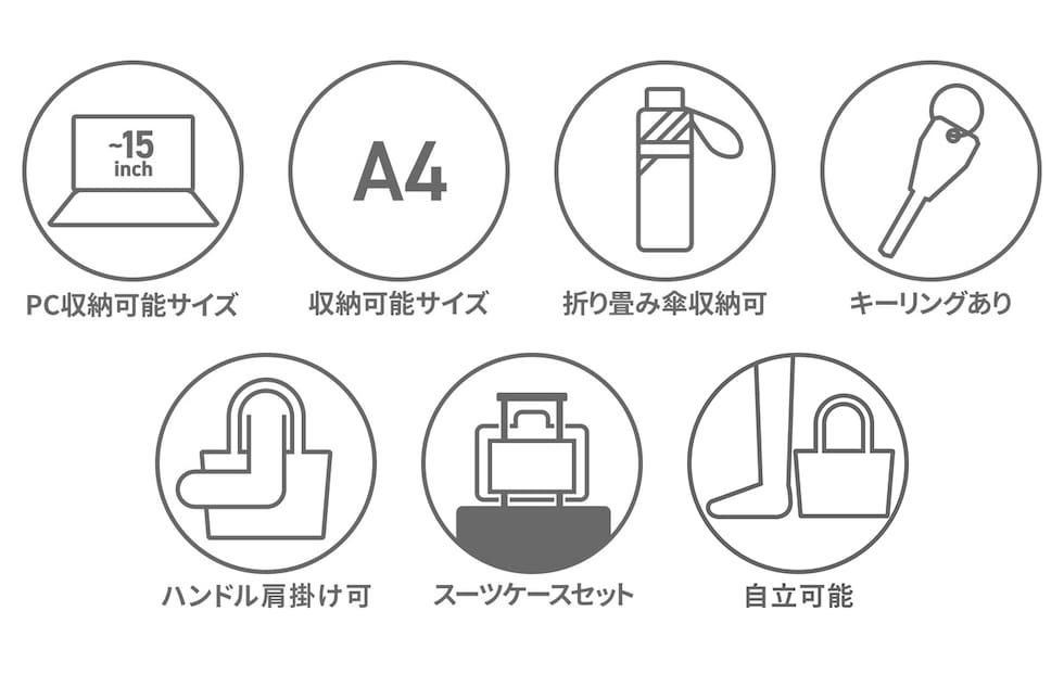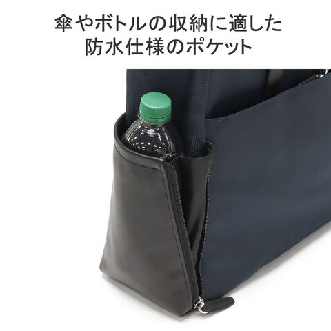 | 仕様 | <外側> ジップポケット(M)×1 ポケット(S)×3 <内側> PC収納×1 タブレット収納×1 ジップポケット(L)×1 ポケット(M)×1 カードポケット×3 ペンホルダー×2 キーフック×1 <付属品> ネームタグ×1 |