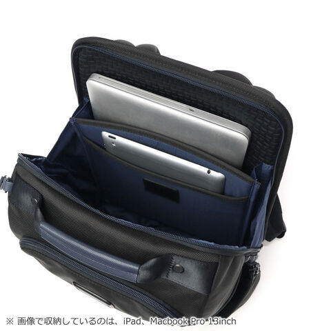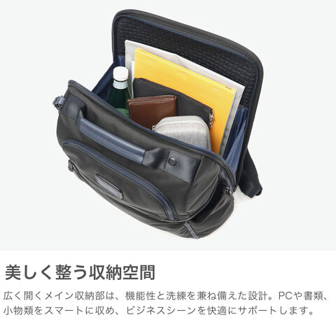 | 仕様 | <外側> ポケット×3 <内側> ポケット×5 PC収納×1 タブレット収納×1 カードポケット×3 ペンホルダー×2 キーフック×1 <付属品> ネームタグ×1 収納袋×1 |