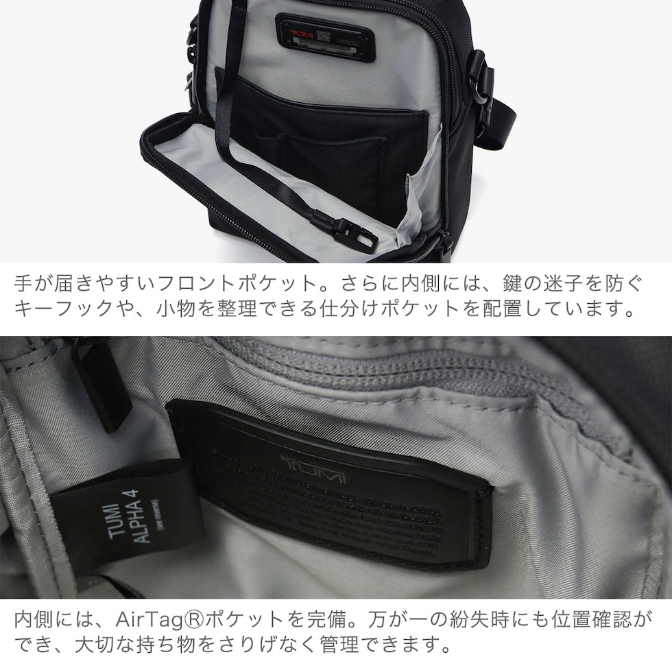 | 美しさ引き立つ 持ち歩きもスマートに TUMIの定番「Alpha4」シリーズのコンパクトなショルダーバッグ。必要な持ち物を無駄なく収められるコンパクトな設計に、AirTag収納ポケットやキーフックなど、使い勝手を高める機能も搭載。軽量で持ちやすく、休日の街歩きやお出かけにも活躍します。実用性に優れた機能を備えた、スマートで洗練された大人のためのアイテムです。 |