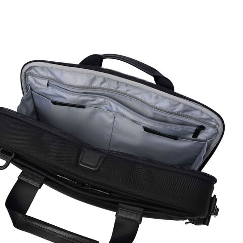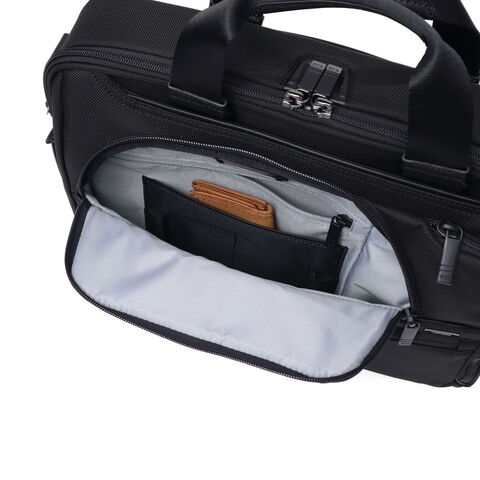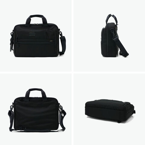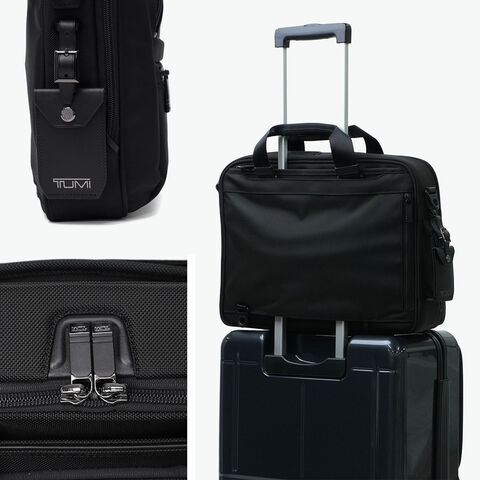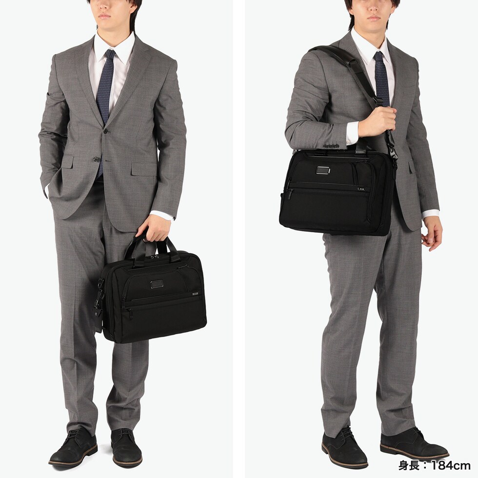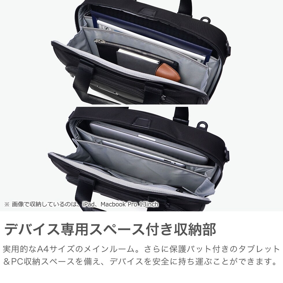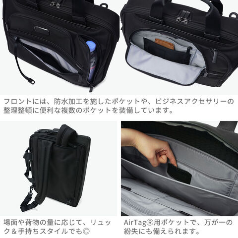 3WAYブリーフケース TUMIの定番『Alpha4』シリーズの3WAYブリーフケース。手持ち・ショルダー・バックパックとして、あらゆるビジネスシーンに即座に対応します。バックパック使用時にはハンドルを内側に折りたたむことができ、洗練されたシルエットを崩しません。PC・タブレットの収納スペースや防水ポケット、AirTagポケットなどの使い勝手を高める収納部も完備。優れた実用性を備えた至高の逸品です。 |