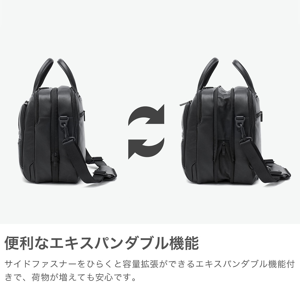 | 仕様 | <外側> ポケット×6 <内側> ポケット×7 カードポケット×2 PC収納×1 タブレット収納×1 ペンホルダー×2 キーフック×1 <付属品> ショルダーストラップ×1 ネームタグ×1 収納袋×1 |