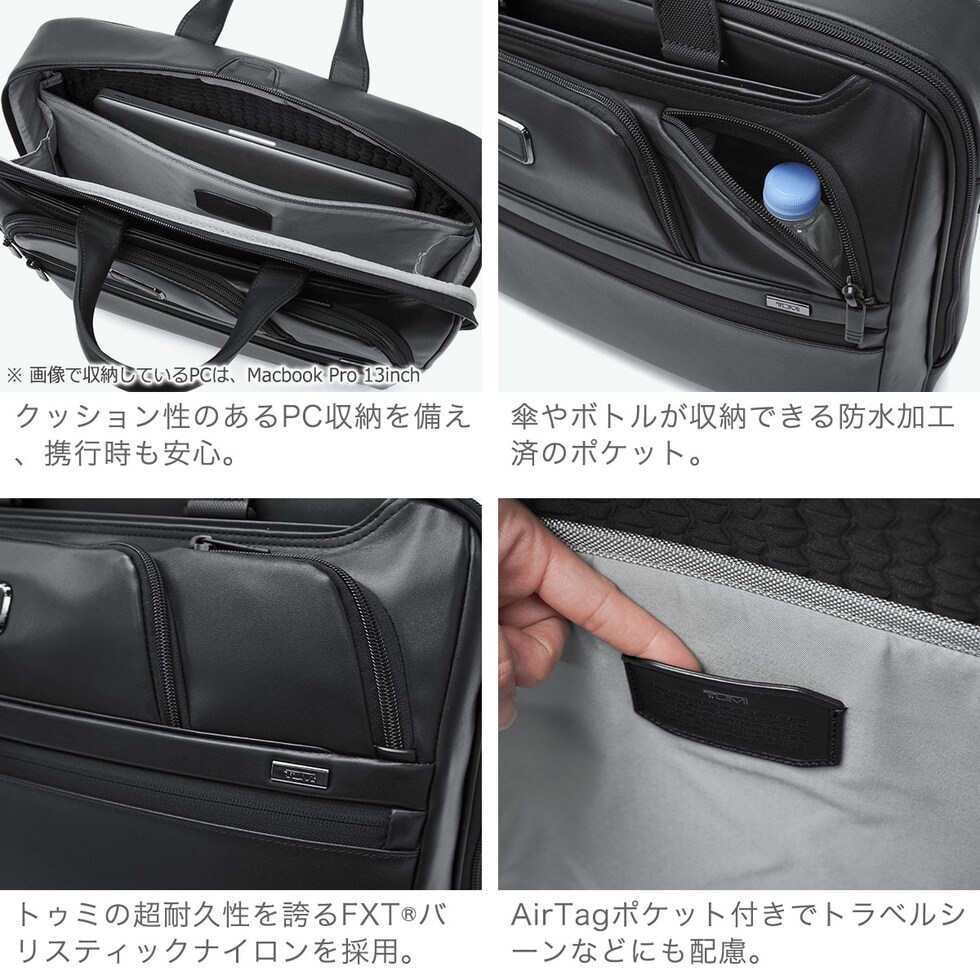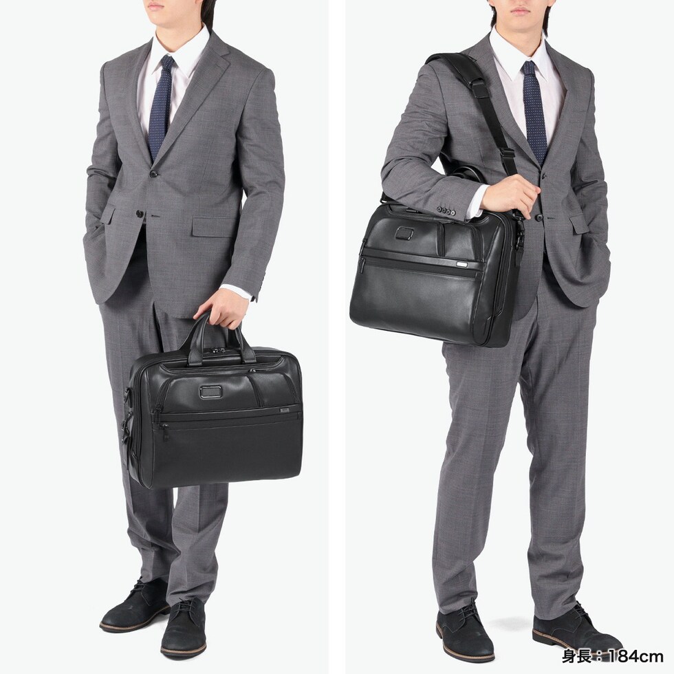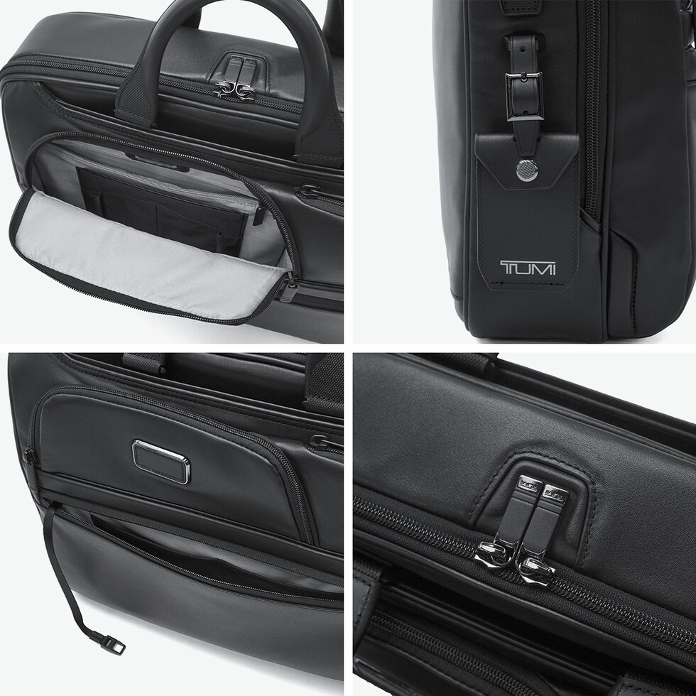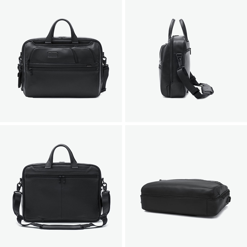 TUMIの定番『Alpha4』シリーズのレザー製ブリーフケース。17インチのPCに対応する高い収納力を備え、クリエイターやファッション業界の方にも最適です。クッション付きPC収納や防水ポケット、紛失防止のAirTagポケットを備え、細部まで計算された設計が洗練された佇まいを演出します。手持ちとショルダーの2WAY仕様で、通勤から出張までスマートに対応。妥協なき機能美を体現する一品です。