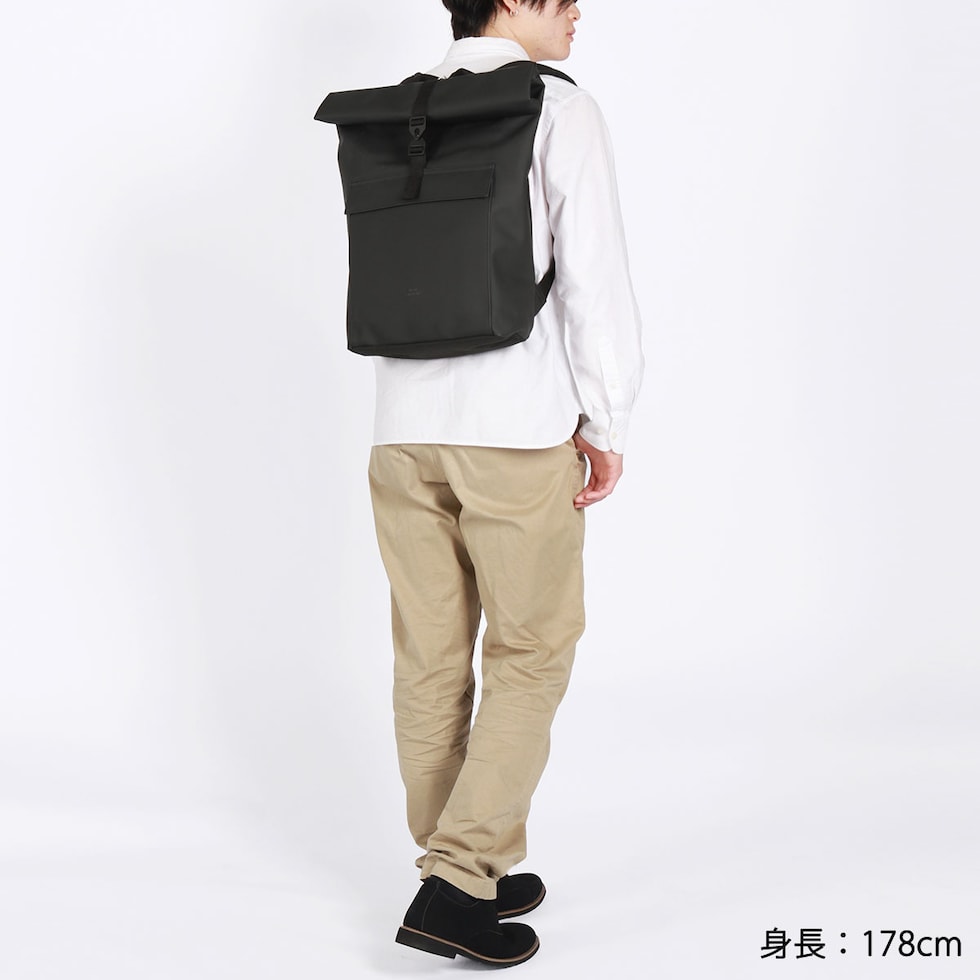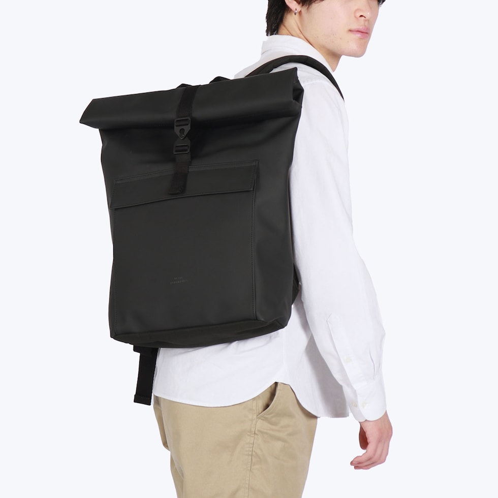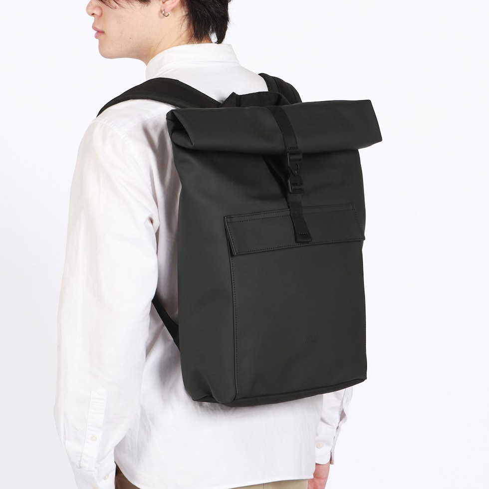 | シックでマットな質感が 大人の洗練された雰囲気 シンプルでミニマルなシルエットが特徴の、どんなシーンにも馴染む洗練されたバックパック。ロールトップ仕様により荷物の量に応じて容量を調整でき、頼れる16Lの大容量を確保しています。環境に配慮したヴィーガンテック素材を採用し、防水性も完備。デイリーユースはもちろん、タフな素材とシックなマット仕上げがビジネスシーンにもスマートにフィットする、ブランドのアイデンティティを体現した一品です。 |
