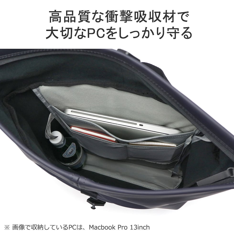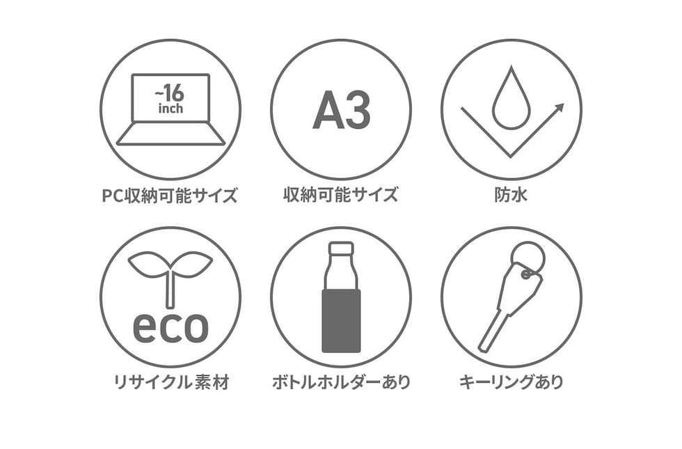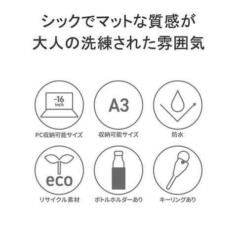 | 仕様 | <外側> ベルクロポケット(M)×1 <内側> PC収納×1 メッシュポケット(S)×2 キーフック×1 ボトルホルダー×1 |