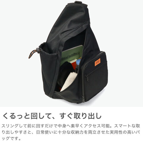| 軽やかにフィットし 日常をアクティブに 懐かしさと新しさを併せ持ったデザインが魅力のボディバッグ。身体にフィットする流れるようなフォルムで、アクティブな日常に心地よく寄り添います。スリングして中身を取り出せる快適な仕様で、収納力も十分。車内でもストレスなく利用できます。ショルダー部分のポケットにはスマホを入れることもでき、マチ付きフロントポケットやメッシュポケットなど使いやすさを追求した作りが魅力です。 |