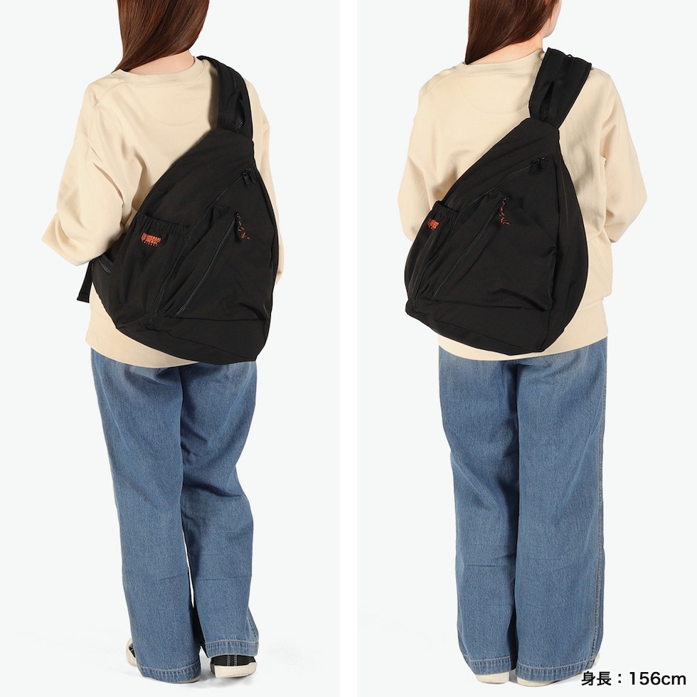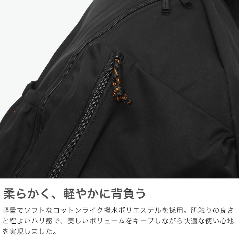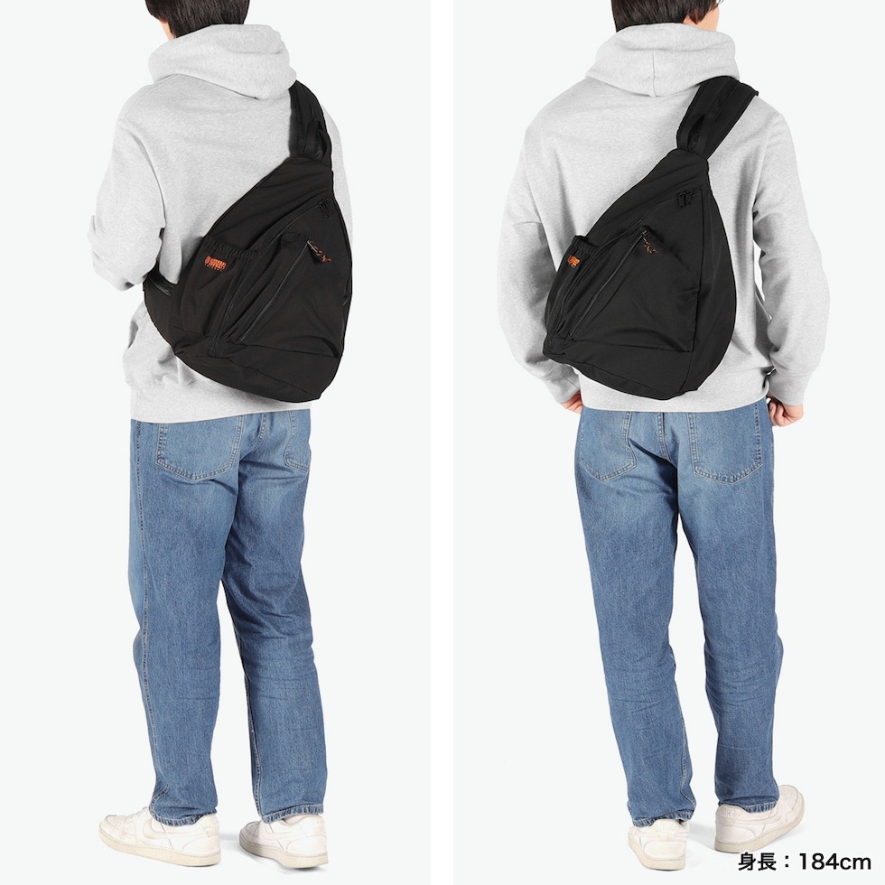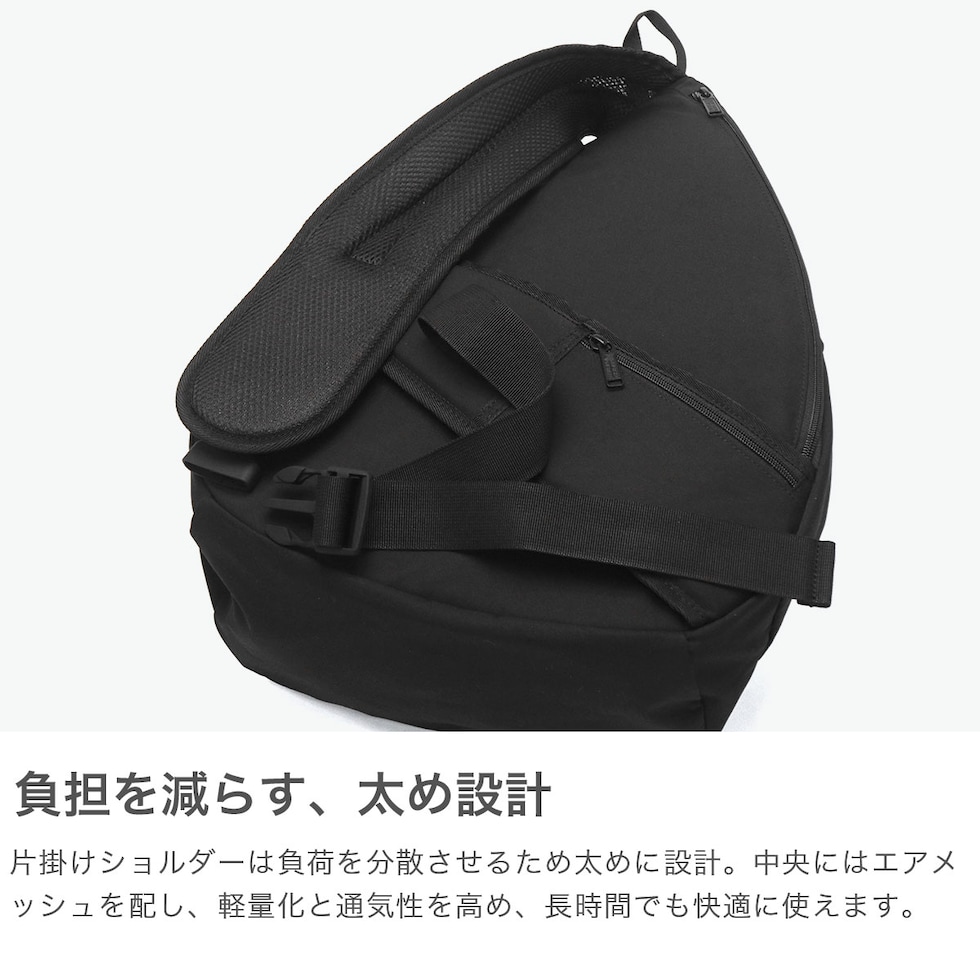 | こだわりの詰まった シルエットと機能性 軽量でソフトな、コットンライクの撥水ポリエステル素材を採用したボディバッグ。底面を広く設計し、より立体感のある三角フォルムに仕上げたこだわりのシルエットが特徴。フロントのマチ付きポケットは全体バランスを考慮し、主張しすぎない大人の表情に。太めのショルダーは中央にエアメッシュを配し、荷重を分散しながら蒸れにくさも確保した完全オリジナル仕様のアイテムです。 |