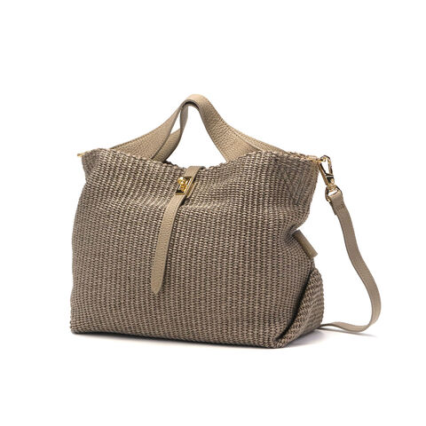 色味と風合いが魅力 上品な風合いが魅力のラフィア調シートを使用したトートバッグ。柔かい雰囲気とさりげない金具使いがポイントになったデザインです。きれいめにもカジュアルにも合わせやすく、日常での必需品がしっかり持ち歩けるサイズ感なので幅広いシーンで活躍してくれます。 |