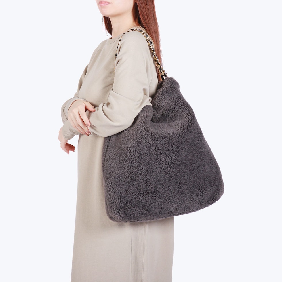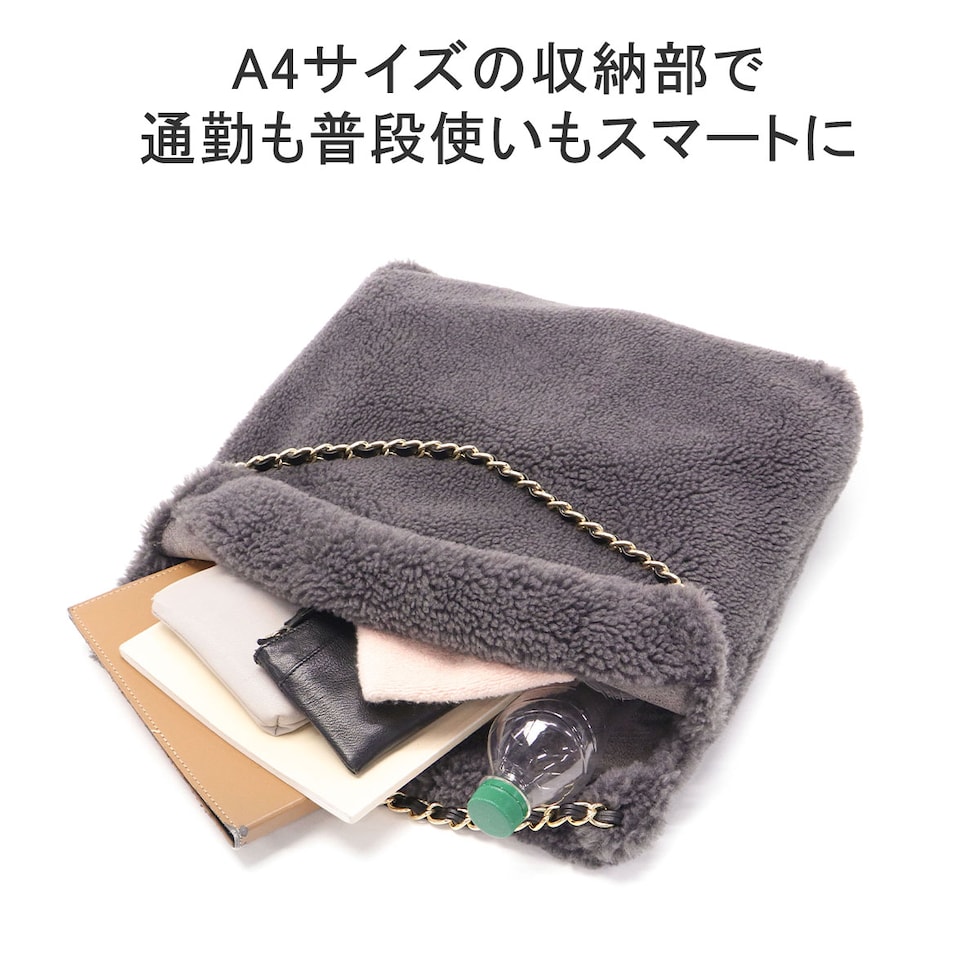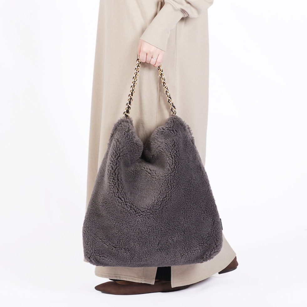 ボアが大人可愛いエコムートンを使用したファーバッグ。カジュアルな雰囲気で温かみのあるボア素材に、華やかなチェーンハンドルを組み合わせたデザインがポイントです。ワンタッチで開閉できるマグネット仕様で荷物の出し入れがスムーズに。ゆったり肩がけできる仕様のため、お出掛けはもちろん、秋冬の通勤バッグとしても最適です。