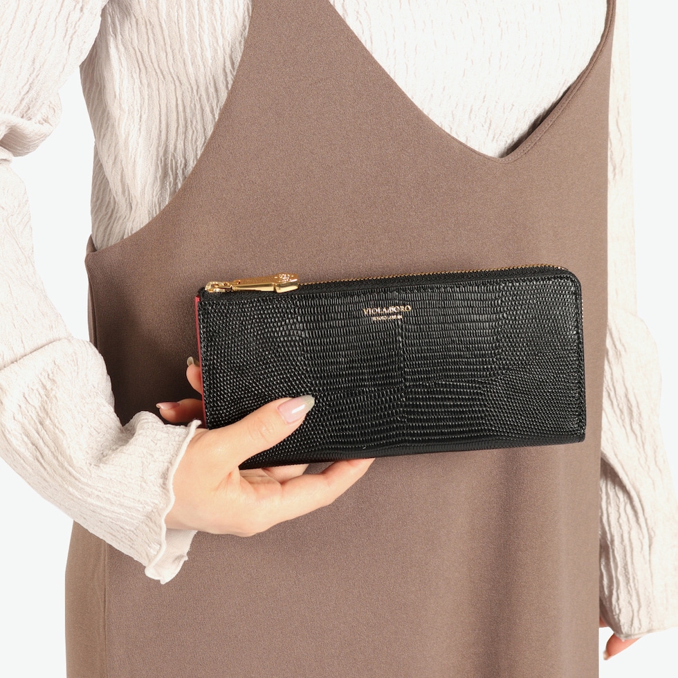 | 型押しレザーが上品 収まりの良いサイズ感も◎ 洗練されたリザード型押しレザーが魅力の『VIOLAd'ORO』のL字型長財布。スリムながら収納力も兼備し、バッグの中でもかさばらない軽やかさ。大きく開く仕様で視認性と取り出しやすさに優れた小銭入れが、デザインのポイントにもなっています。上品な佇まいで、手元を美しく演出する日本製ウォレットです。 |