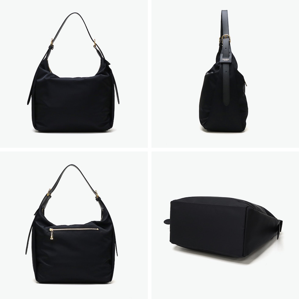 | 品よく決まる ホーボーバッグ 弱撥水効果のあるナイロン生地と、イタリアンレザーを使用したホーボーバッグ。ハンドルは長さ調節が可能で、無理なく肩掛けができるのが嬉しいポイント。豊富なポケットで荷物をしっかりと整理できるので、普段使いはもちろん通勤などでも活躍します。 |