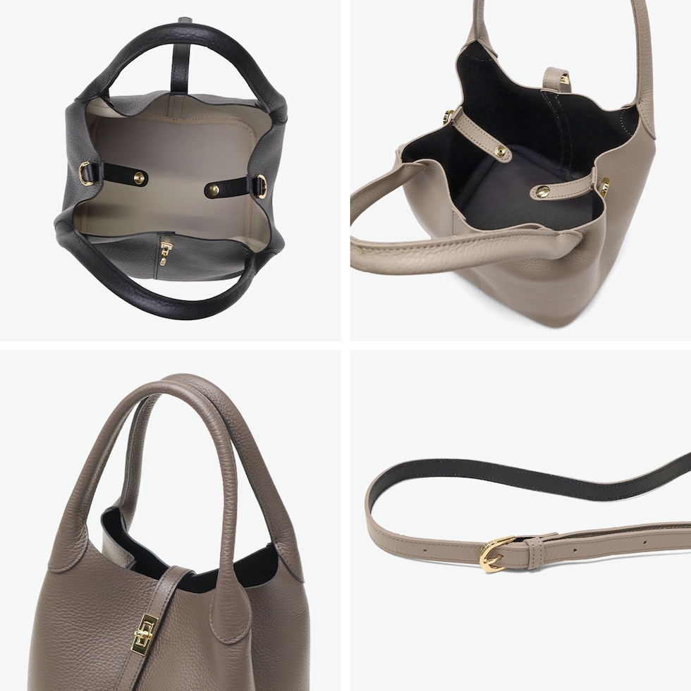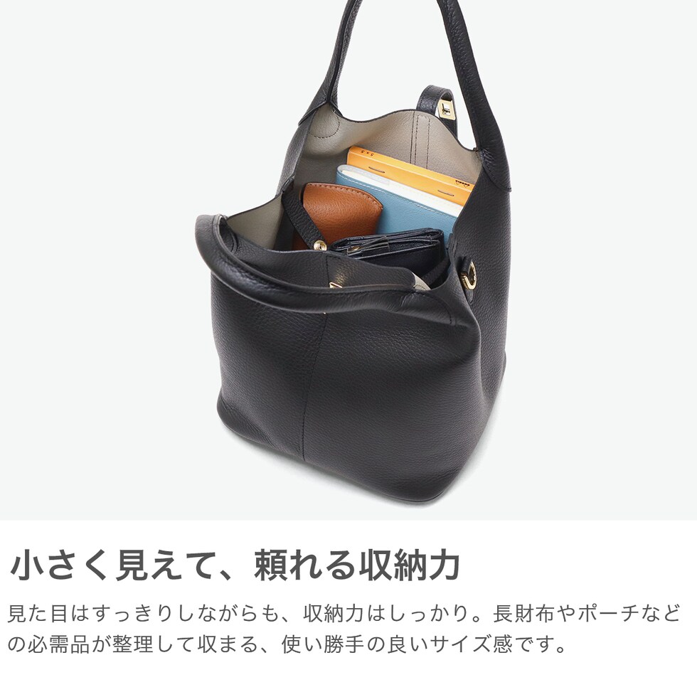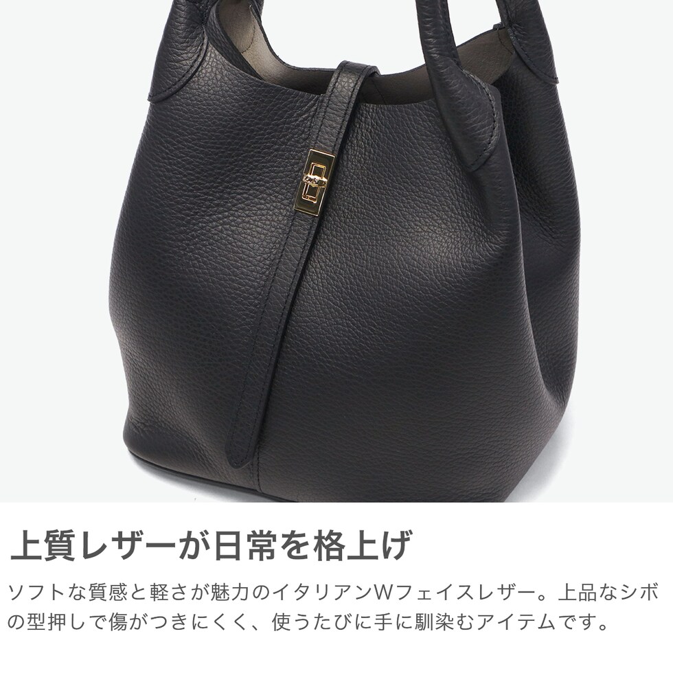 | 日常に品よく馴染む 上品デザイントート ソフトで軽やかなイタリアンWフェイスレザーを使用した、上品なベルト付きトートバッグ。傷が目立ちにくいシボ型押しで、毎日使いにも安心。コンパクトながら長財布がすっきり収まる実用的なサイズ感。2WAY仕様で通勤から休日まで幅広く活躍します。 |