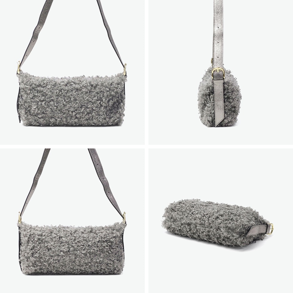 もこもこのカールが魅力的のカルガンラムタイプのエコファーを使用したショルダーバッグ。長財布やポーチなどの必需品がしっかり収納できる使いやすいサイズ感で、ファスナー開閉のため安心です。ショルダーストラップは長さ調節が可能なため、お好みの持ち方でスタイリングを楽しめます。秋冬のコーディネートに暖かさとトレンド感をプラスするアイテムです。