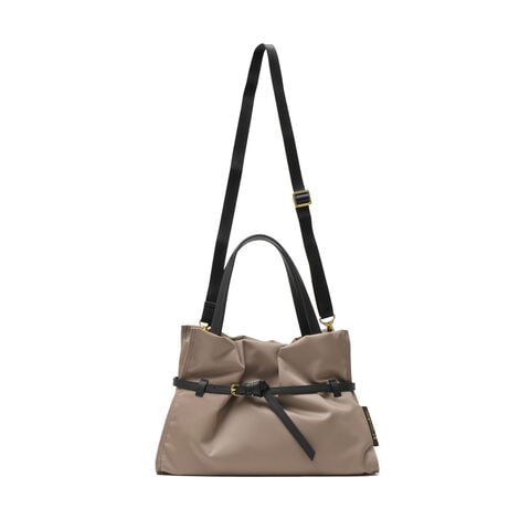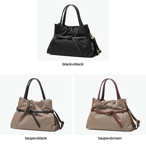 大人かわいいトート カジュアルなナイロン素材にレザーのベルト使いが大人女性が持ちやすい上品な2WAYトートバッグ。A5サイズ対応のコンパクトさがポイント。開閉部分にゴムを入れ、あえてステッチを入れないことでクシュっとしたギャザーが生まれ、女性らしさと適度な抜け感を兼ね備えたデザインです。ふわりと馴染むような柔らかさとたっぷりとしたシルエット、キレイめだけど気取らない、そんな理想を形にしたアイテムです。 |