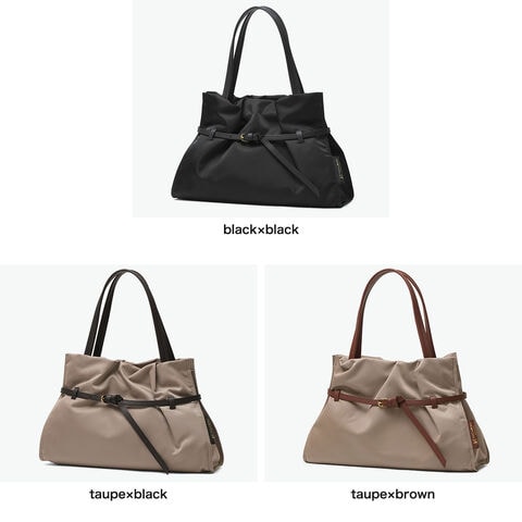 大人の雰囲気漂うトート 機織りからコーティングまで製造を国内で生産しているこだわりのナイロンを使用したトートバッグ。光沢感を抑えたマットな質感のナイロンは高級感があり、大人女性が持ちやすい生地感です。ギャザーの可愛らしさをレザーのベルト使いでほどよく引き締めたデザイン。A4サイズがちょうど収まるサイズ感で、お仕事用にもおすすめ。ふわりと馴染むような柔らかさとたっぷりとしたシルエット、キレイめだけど気取らない、そんな理想を形にしたバッグです。 |