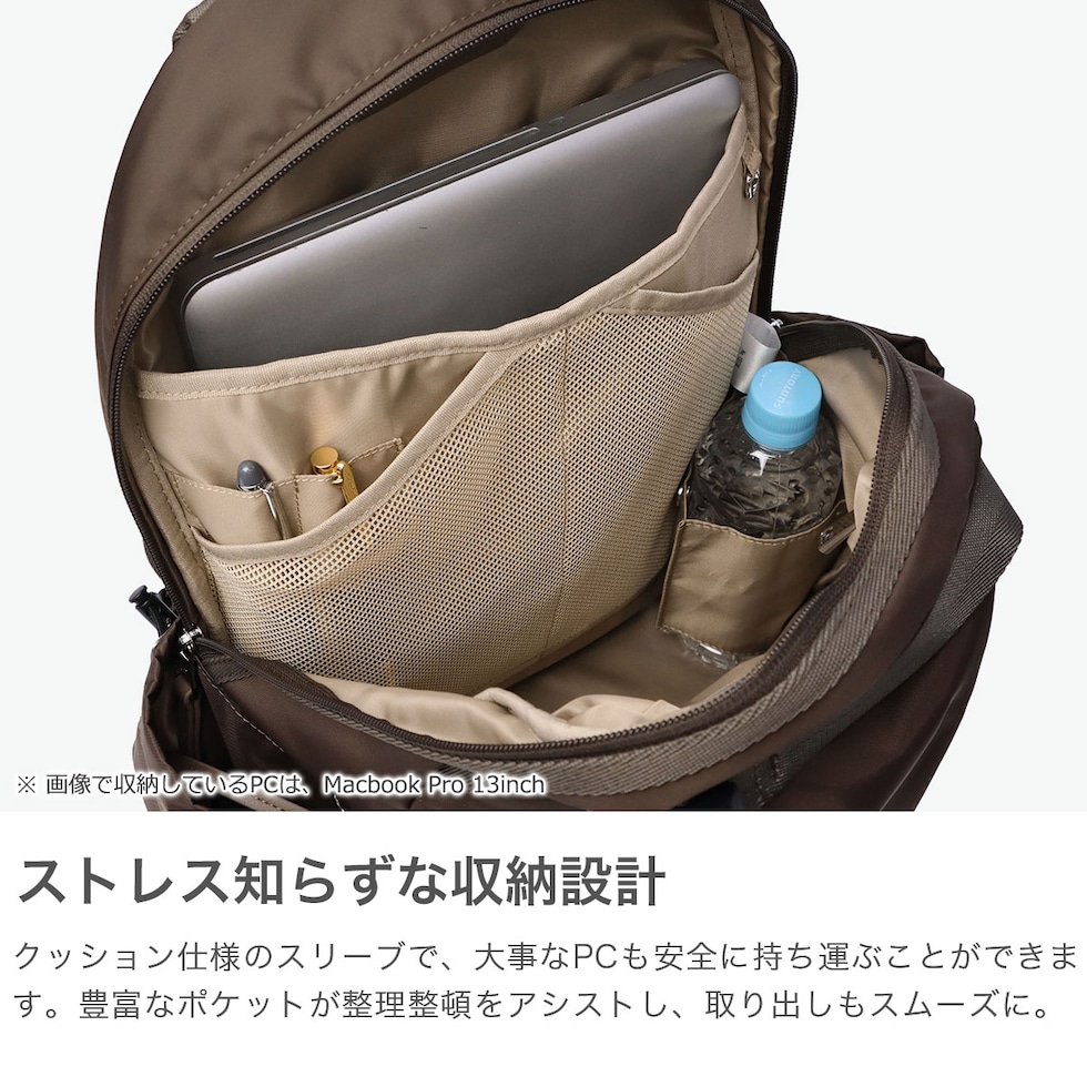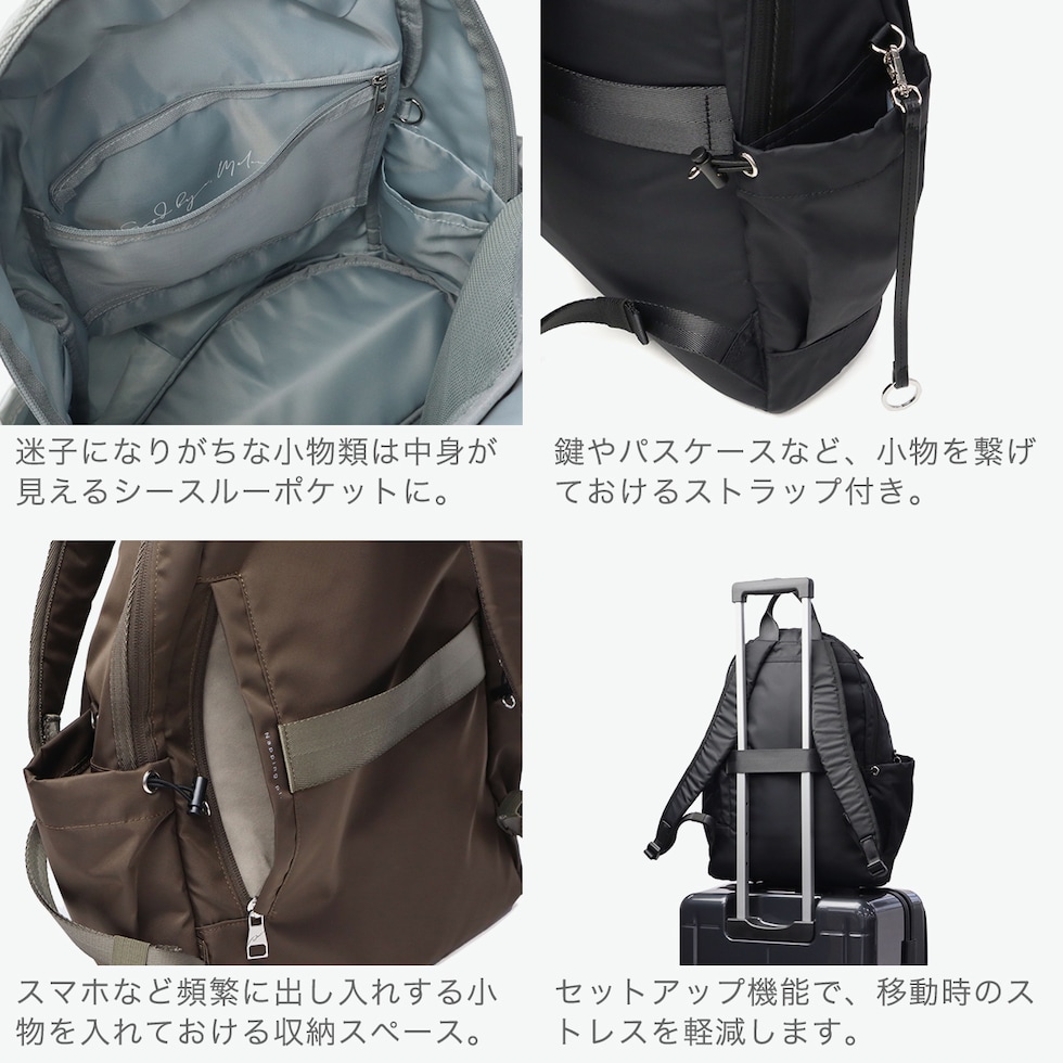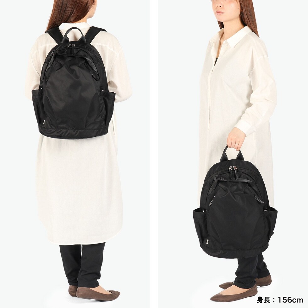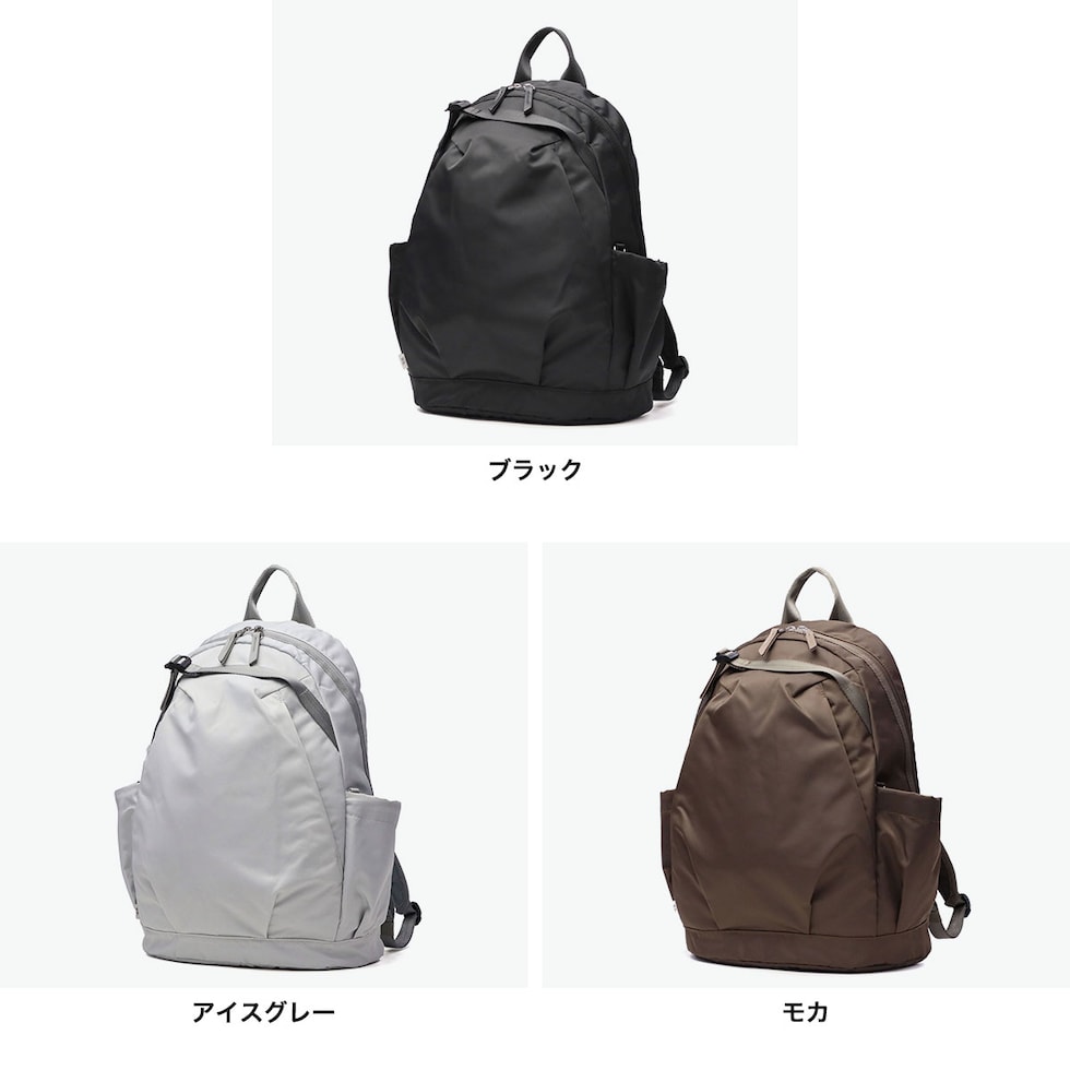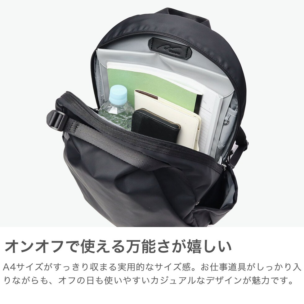 | 働く女性にフィットする 頼れる機能性リュック 見た目はカジュアルでも、しっかりとお仕事に対応したリュックです。軽くてたっぷり入る19Lサイズで、PCや書類もすっきり収納。上品見えする艶のあるナイロン素材と、毎日使いたくなる機能性で、通勤もお休みの日も“楽ちん”に寄り添うアイテムです。 |