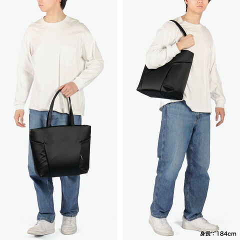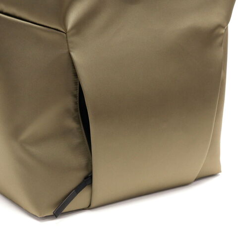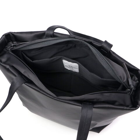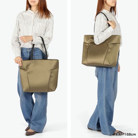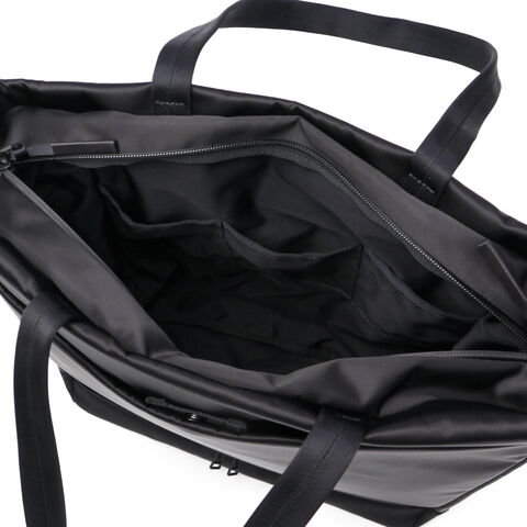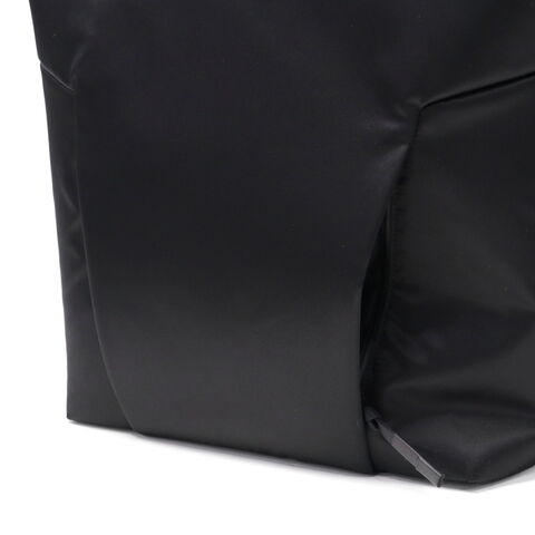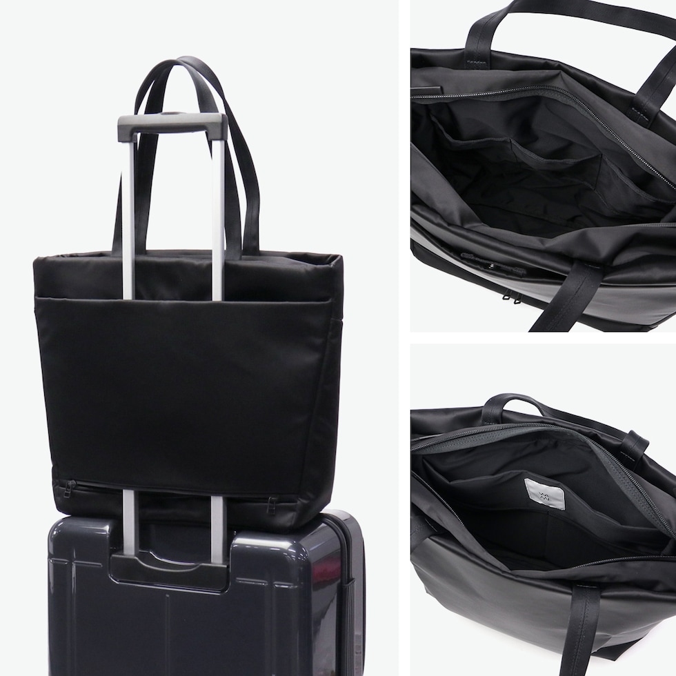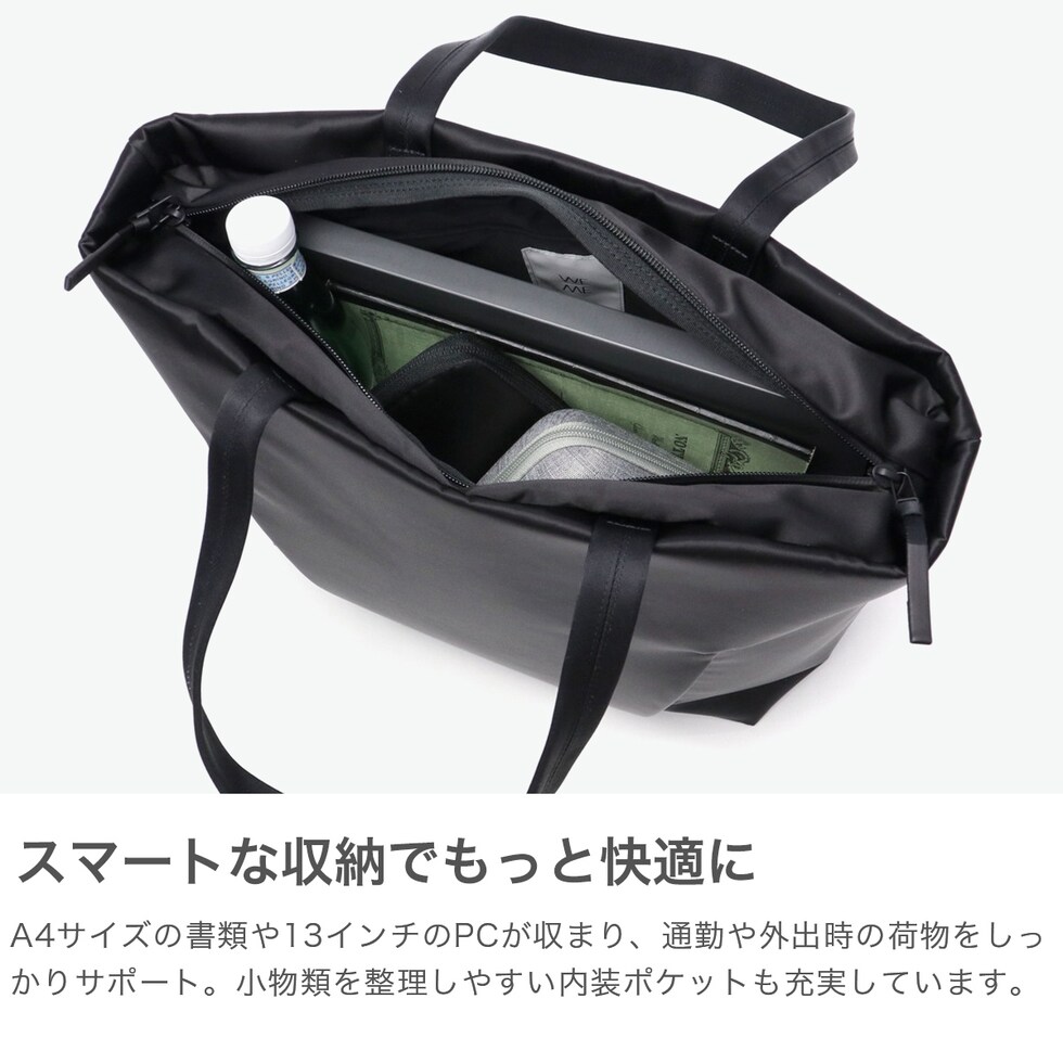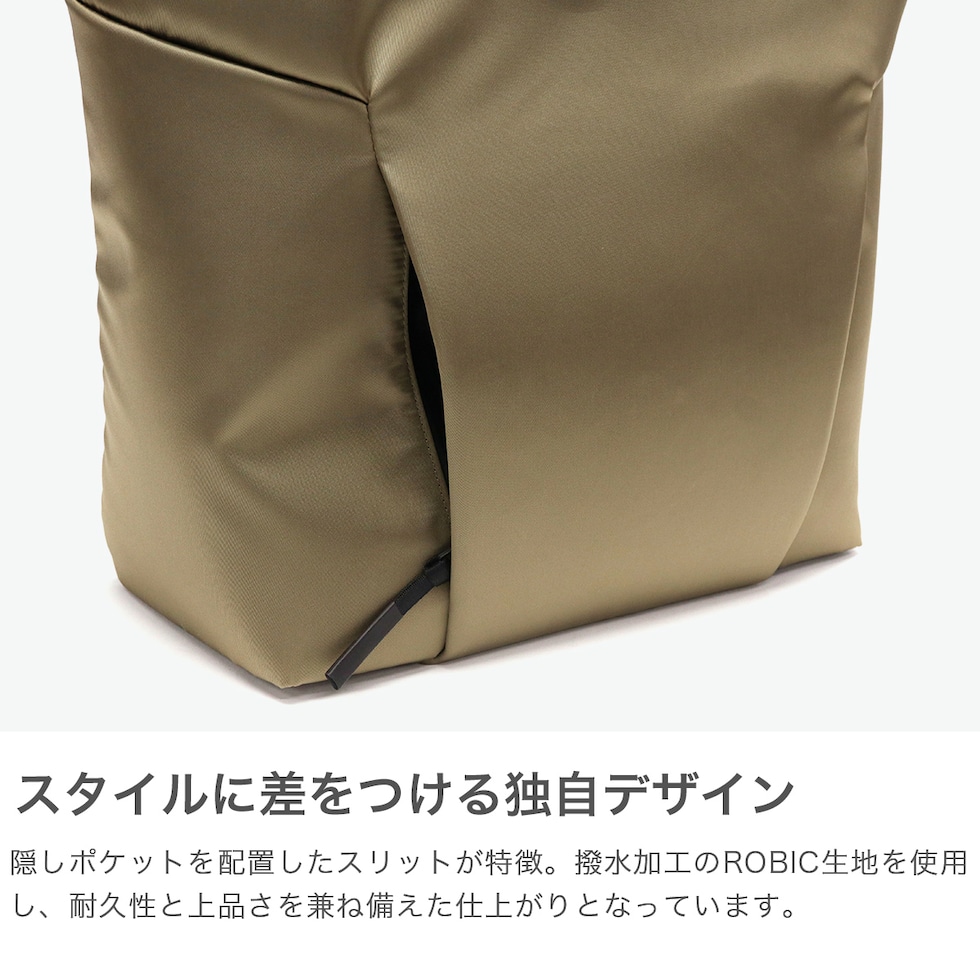 タフなトートバッグ FOLDの独特な裁断パーツを逆さまにしたソリッドな見た目のトートバッグ。メインルームにはA4サイズがゆったり収まり、PC収納に加え小物が管理しやすいポケットを豊富に備えています。正面スリット部にはそれぞれ独立した隠しファスナーポケット、背面には下部ファスナーを開けるとキャリー取り付け可能なホック付きポケットを装備。引き裂きや摩耗の強度に優れた生地を採用し、繊細で上品な光沢を持ちながらも耐久性に優れたタフな仕上がりになっています。 |