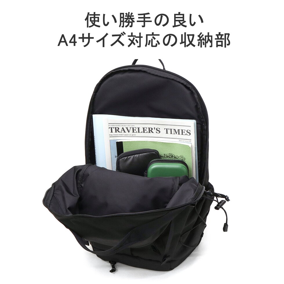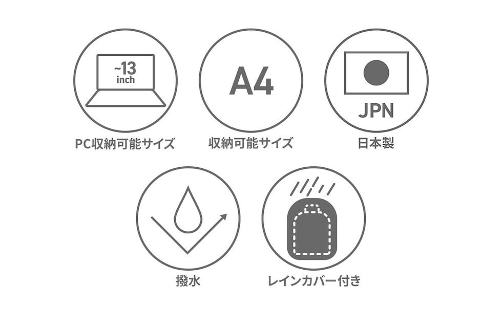 | 仕様 | <外側> バックルポケット(L)×1 ジップポケット×(M)×1 └ 内蔵 ベルクロポケット(S)×1 ジップポケット×(S)×1 格納式レインカバー×1(取り外し可能) <内側> PC収納×1 |
