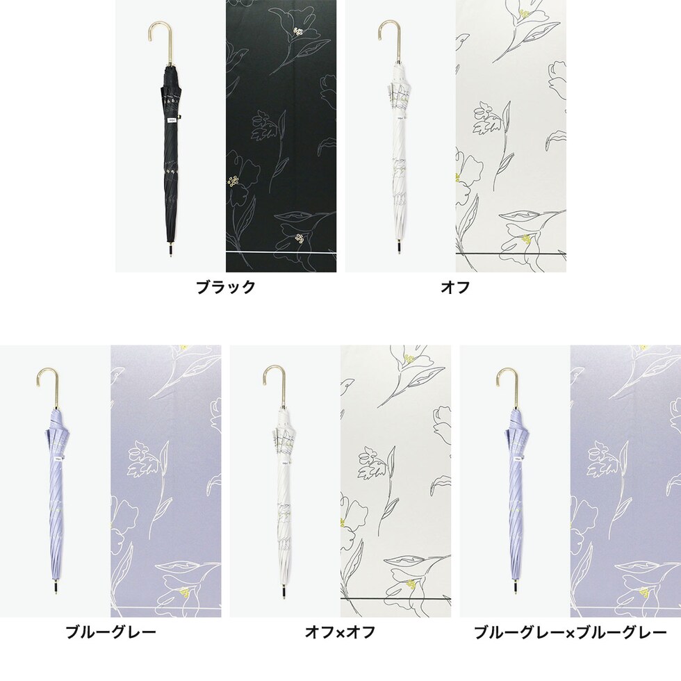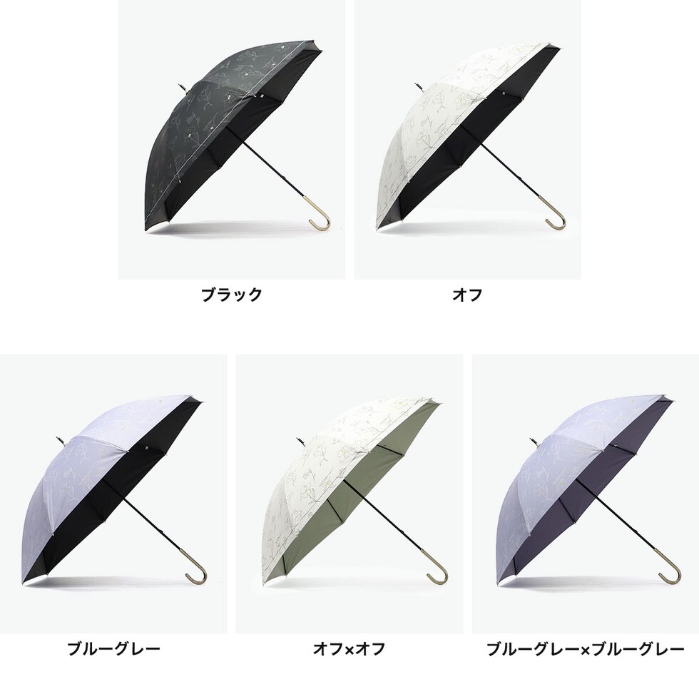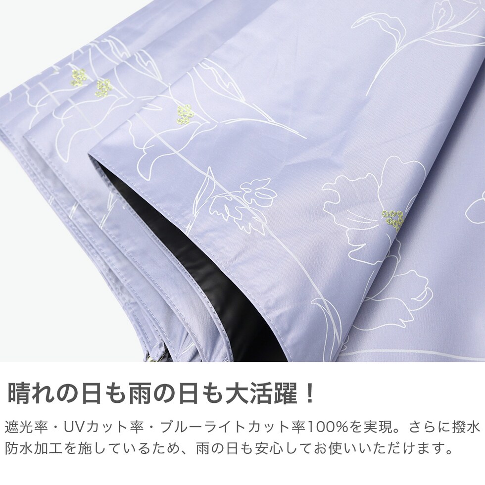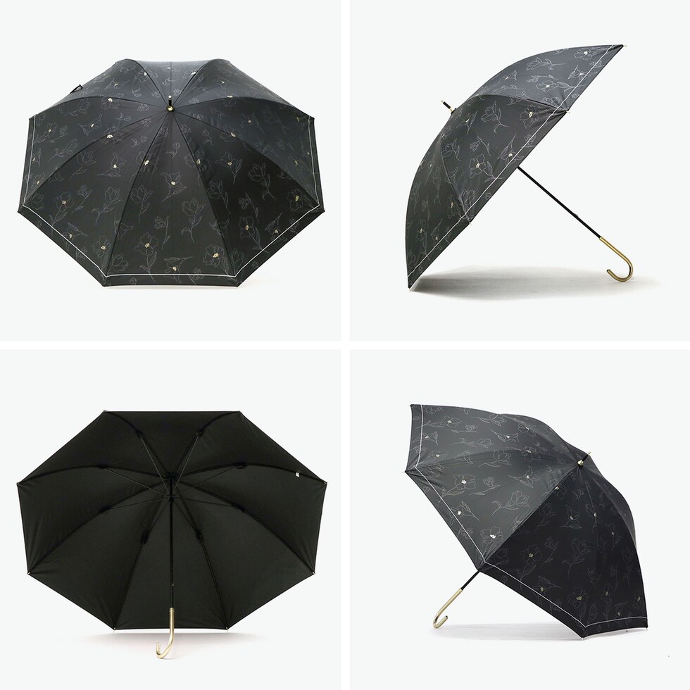 | 大人エレガントで華やか フラワーデザイン傘 傘を開くと雨の日でも気分が晴れそうな、美しいフラワーデザインの晴雨兼用傘。持ち手には女性の手元を美しく見せてくれるフェイクレザーを採用。遮光率・UVカット率・ブルーライトカット率100%、UPF50+を実現し、親骨は大きめの55cmで紫外線をしっかりガードしてくれる、頼もしい1本に仕上がっています。 |