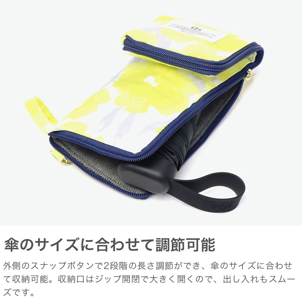 | 雨の日を華やかに彩る アンブレラケース 濡れた傘の持ち運びに便利なアンブレラケース。本体の内側に吸水素材を採用し水滴を吸収、外側の撥水素材が水をはじいてくれるので快適に使用できます。スナップボタンで2段階の長さ調節ができ、傘のサイズに合わせて収納可能。カラフルな絵柄が雨の日に彩りを与えてくれるアイテムとなっております。 |